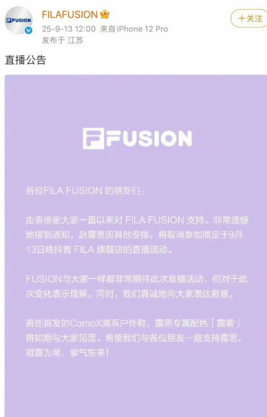 事情是这样的,赵露思原本答应了品牌fila斐乐会参加9月13日的直播,结果在13日要直播的当天,fila发声明表示赵露思因其他安排,将取消参加原定的直播。