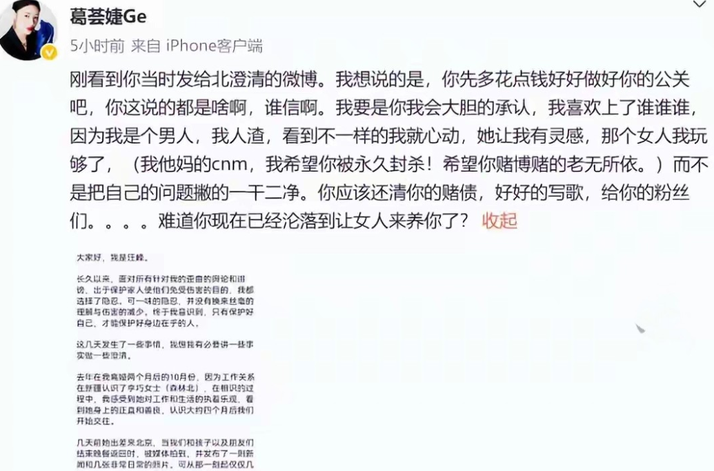 前妻葛荟婕怒斥汪峰,火力全开,一点不留情面! 9月15日,一条关于“前妻葛荟婕怒斥汪峰”的词条登上热搜,瞬间引发热议。 事情的起因,葛荟婕凌晨发文,并附带一张截图,一顿疯狂输出,看完内容,这……,真是火力全开,不留一点情面。 感觉葛荟婕言语中充满愤怒,各种嘲讽,还有爆料,尤其这一句:“愿你老无所依”,有一说一,真的有点过了。 再看转发的截图,内容是汪峰在5月20日,发布的一篇为森林北澄清的博文,这……,时间都这么久了,才看到,然后还怒不可遏,就有点不理解了。 至于葛荟婕和与汪峰之间的矛盾和恩怨,细节不得而知,就算心里万般委屈,也没必要在网上发泄,毕竟两人有共同的女儿。 咱就说,如果小苹果看到了,一边是妈妈,一边是爸爸,该有多难受啊! 既然当初选择分开,就应该各种安好,互不打扰,开开心心的生活。