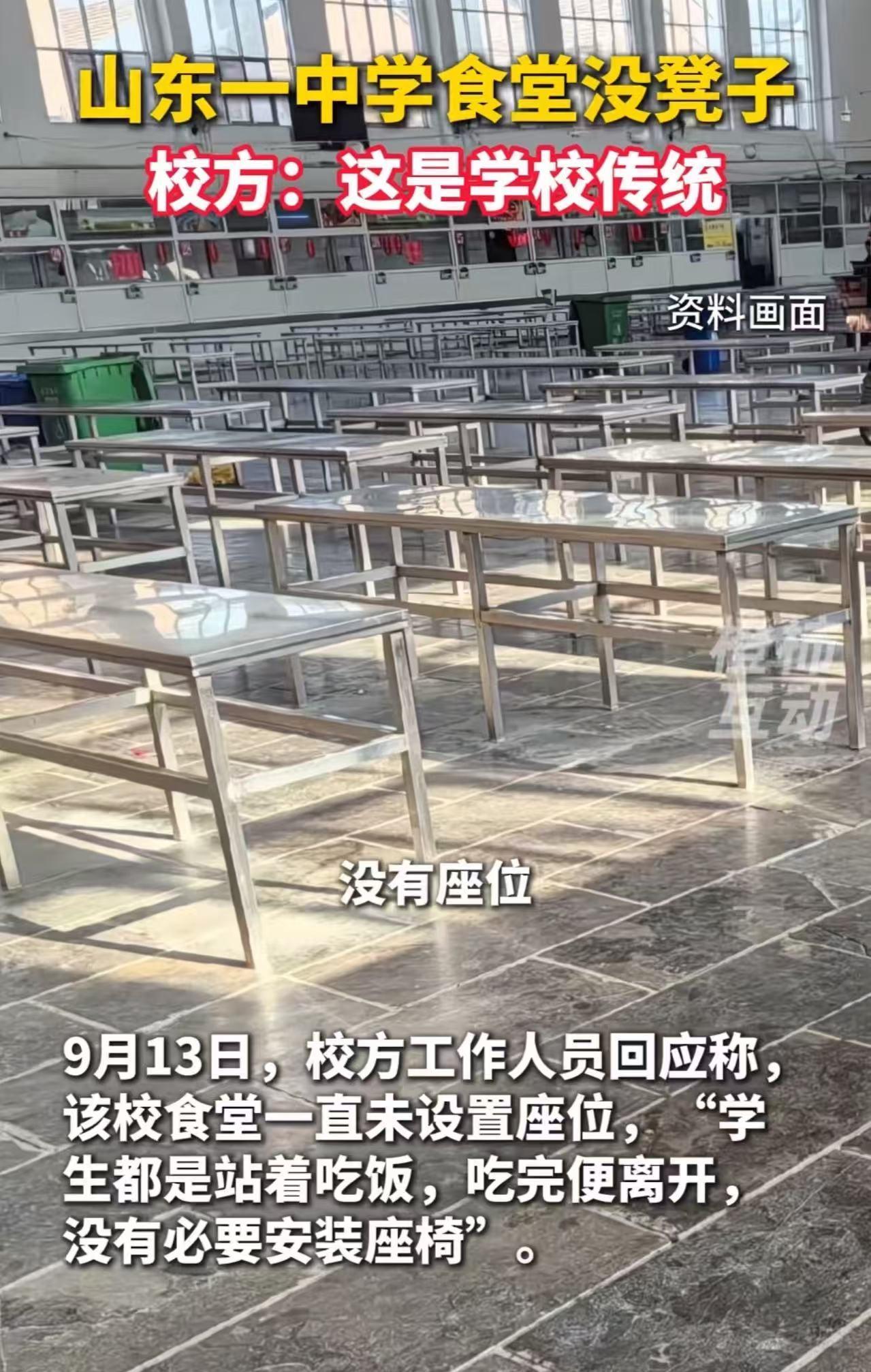 吵翻了!山东聊城冠县,一中学食堂没有座椅、全体学生需要站着吃饭!有家长看不下去,投诉学校不作为!学校回应:“这是学校的优良传统,站着吃饭对孩子好,没有必要装!”网友:不知道老师校长他们坐着吃还是站着吃?他们要是站着吃,我没意见! 网传视频显示,用餐时间学生在桌旁两排站着用餐,有些孩子身体高,还需要弯着腰吃饭,姿势非常不舒服。 家长看到后就很心疼,孩子上了一天的课,连一顿饭都不能好好吃! 于是家长把这事情发到网上,他们吐槽说:哪有吃饭让人站着的就算监狱里的犯人也有位置吧! 可学校回应:“这是学校的传统,一直没座位,站着吃,吃完就走没必要装座位!且食堂是省级优质食堂,饭菜营养丰富。” 此事引发了热议,有网友说,让孩子吃点苦也是好事情!我1990年高中毕业后上新学校,食堂里也只有桌子没有凳子,大家都是站着吃饭,吃完自己洗饭盒拿回宿舍,不耽误时间。现在的孩子都太娇贵了! 也有网友说,人,一要生存,二要享受,三要发展。吃饭是一种享受。也是一件大事。如果连吃饭都不当一回事,请问还有什么事比吃饭更重要的呢?所有折磨人的理念措施都是残酷的、反人类的,不管你的理由有多么冠冕堂皇! 还有网友说,这是根本不把学生当人!以前学校可能条件不好,没钱买椅子,现在条件都好了,为什么还要让孩子吃这样的苦?按照这样的逻辑,那教室也不要安装风扇和空调呢,反正以前也没有,应该让孩子吃吃苦! 我看了一下评论区,基本上分为两派: 1、上了年纪的中老年,或者思想古板的,支持学校让学生站着吃饭,理由是学生上课坐了半天了,回到教室还得继续坐,站着吃饭刚刚好! 2、年轻人觉得教育不应该只是课堂上的填鸭式教育,学生的身心健康也很重要,吃饭是大事,坐着吃饭是基本权利应该得到保障。 我觉得,如果校领导和老师能以身作则,日日挺直腰板在食堂“速战速决”,倒也算言行一致;可若一边要求孩子弯腰屈膝,一边自己安坐于椅,这分明是双标至极的“权力表演”。 孩子不是流水线上的零件,吃饭更非需“提速”的任务,连监狱都保障犯人座位,学校却以“节省时间”为由剥夺基本舒适,何谈“省级优质食堂”? 所谓“营养丰富”的饭菜,配得上弯腰驼背的狼吞虎咽吗? 那些鼓吹“吃苦教育”的人,不妨先回家试试全家站着用餐——若自己都做不到,又怎有脸要求孩子? 教育若只剩形式主义的“苦”,而丢了人性化的“暖”,那才是真正的反教育、反人性!