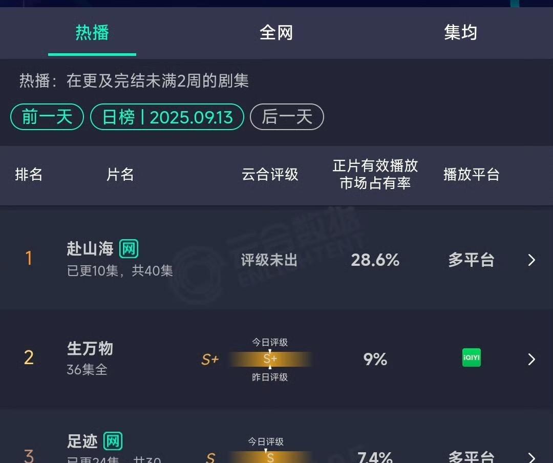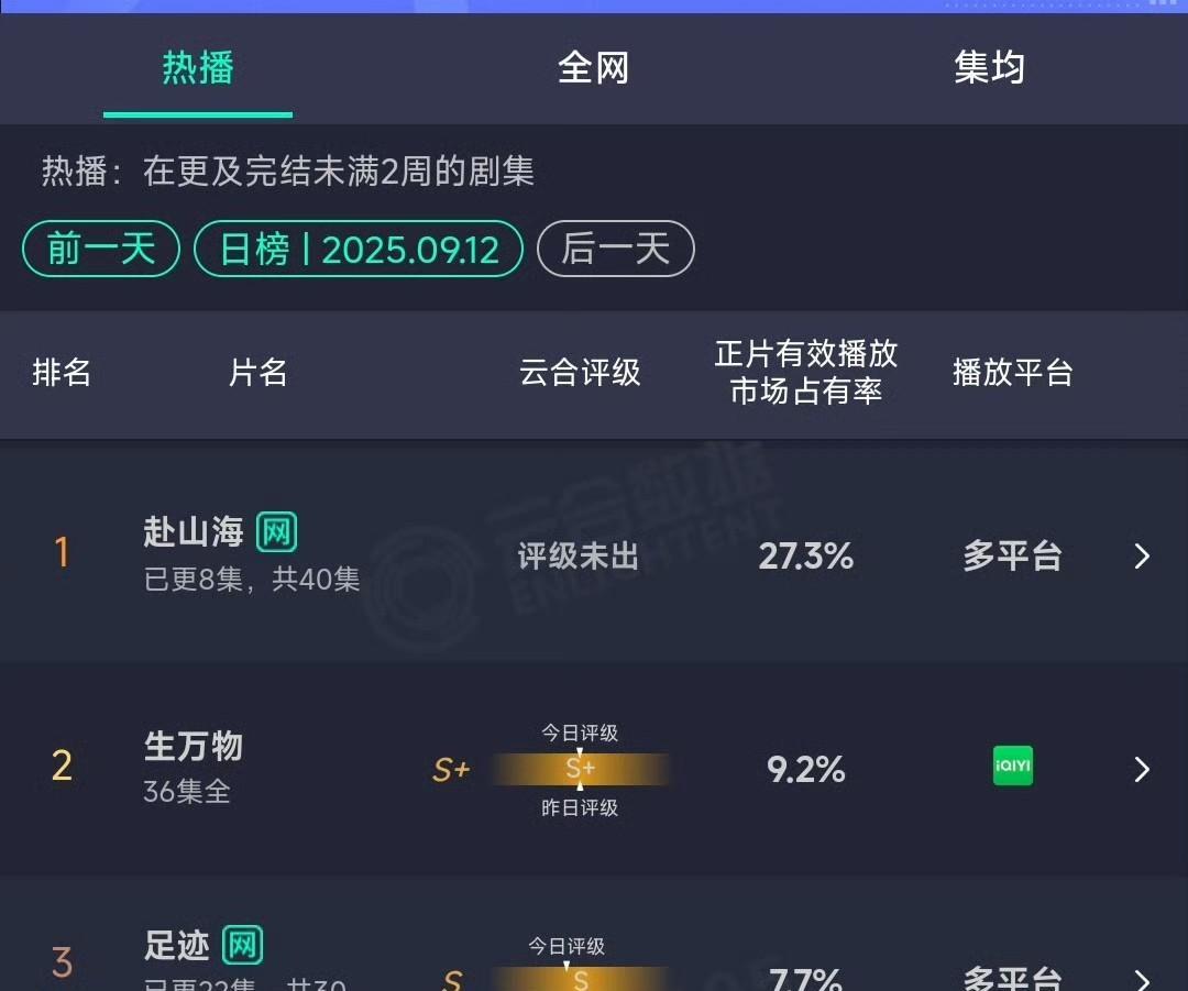 《赴山海》现在的走势,基本就是“爆开低走”。 首日,云合市占率达到16.8%,这数据着实亮眼,不过这背后有史无前例的大规模云包场助力,还有铺天盖地的营销手段。 然而,即便营销攻势一刻未停,第三天,收视率开始横盘。这意味着剧集并没有成功吸引到新的观众加入。 再加上口碑急剧下滑,观众对这部剧质量的评价几乎是一边倒的差评,后续想要扭转局势,恐怕是难上加难了。