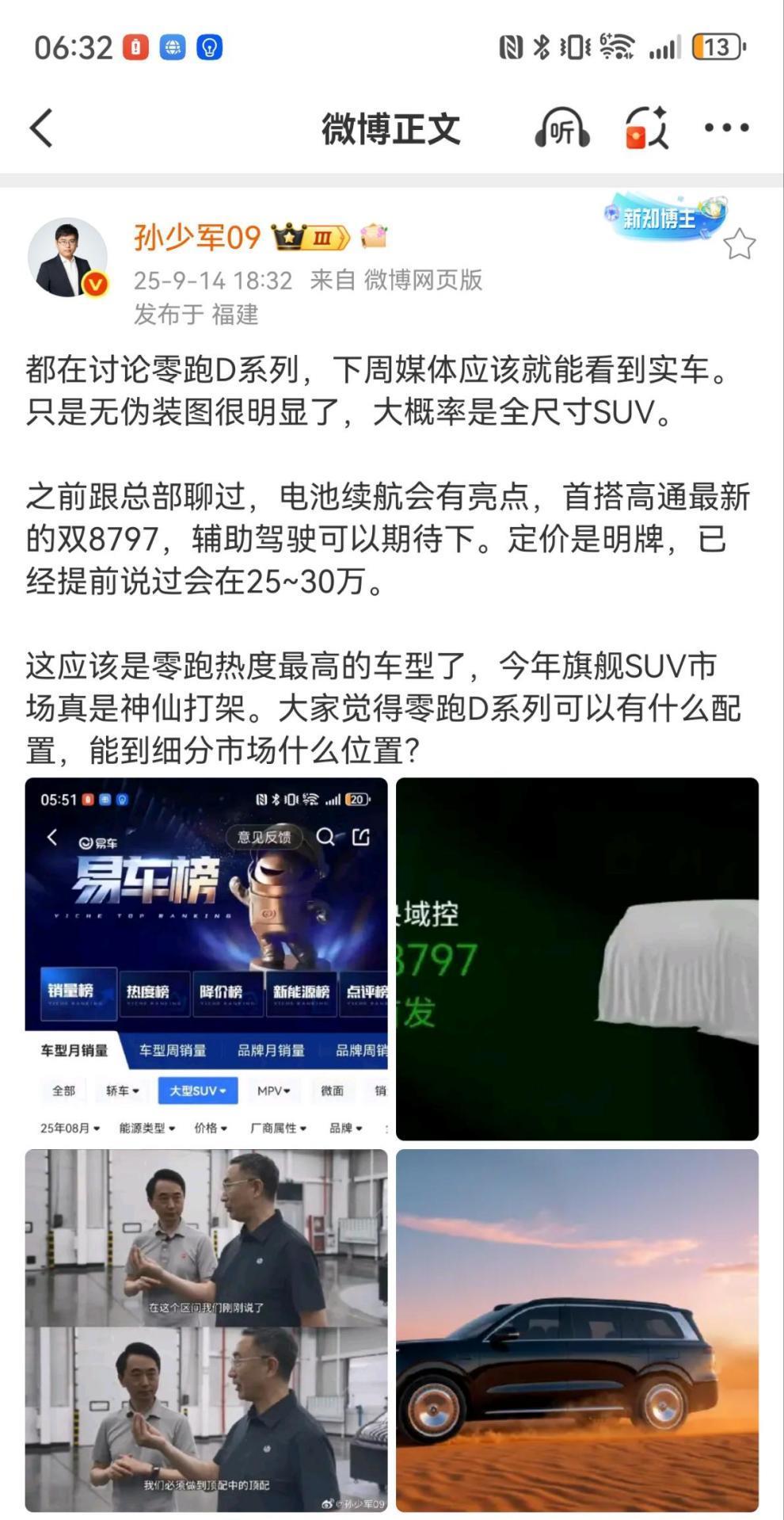 零跑旗舰SUV新作更多图片曝光,这款新车看着相当不简单! 近日,网上曝光了零跑D系列旗舰新产品的图片,瞬间就引来了热议。 从曝光的图片来看,这台旗舰SUV气场强大,整车线条流畅舒展,造型方正,甚至可以用“巨舰”来形容;同时它在细节处采用了银色的窗框镀铬饰条点缀,再配上造型别致的大饼轮毂,高级感油然而生,对比当下在售的高端旗舰新能源SUV完全不落下风。 然后从一些博主的发文中我们也可以了解到,这台旗舰车型大概率是全尺寸SUV,还会首搭高通最新的8797芯片。而且在此前零跑CEO朱江明的访谈中,也透露了这台车的定价,预计售价区间是25万-30万元,朱江明还特别强调,这款新车要做到“顶配中的顶配”,有望搭载零跑乃至整个行业领先的技术,带来卓越的用车体验。 另外,前段时间零跑高级副总裁曹力也发文称,这台新车已经进入夏测,看样子离正式和我们见面已经不远了,我们就敬请期待吧。#零跑汽车##造车新势力#