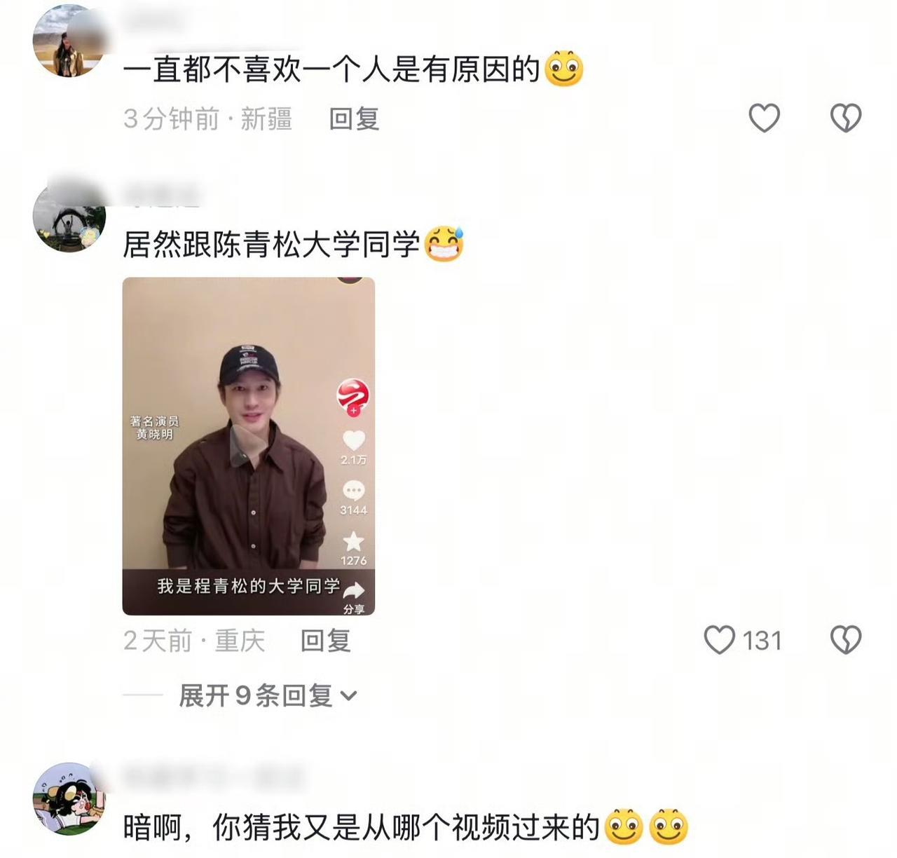 真没想到,因为于朦胧事件,还扯上黄晓明了? 咱就是说不知道该夸黄教主耿直还是说他本人情商一般呢? 因为黄晓明和程青松是大学同学,本人的社交平台评论区被冲了, 感觉黄晓明不是在被骂就是在被骂的路上,挺惨!去年因为女朋友,今年因为同学。[笑哭] 黄教主最近还是避避风头吧! 其实这个视频我看了,是几个月前的祝福,还有陈建斌等人,黄晓明这是干啥都被网暴,也是没谁了。