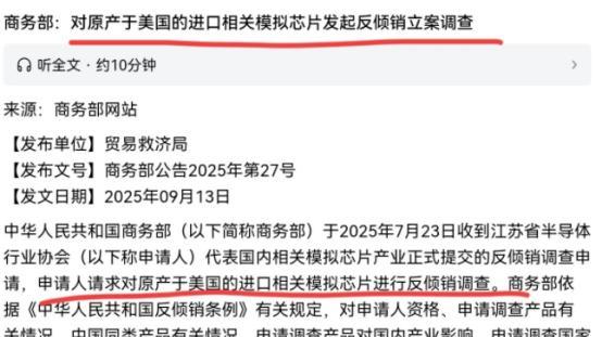 大快人心!我们对美国进行反制,美国的行为,我们决不惯着!在中美即将在西班牙马德里举行经贸谈判之际,美国突然在背后做小动作对我们的半导体、生物科技、航空航天、商贸物流等领域多家中国实体实施制裁。很显然,美国此举,就是为了在9月14日会谈前制造筹码,迫使我们在谈判桌上让步。 可咱们根本没在怕的。不到二十四小时,中国商务部直接甩出反制大招——宣布对原产于美国的进口相关模拟芯片发起反倾销调查。这一刀砍得又准又狠。调查范围直接覆盖通用接口芯片和栅极驱动芯片这些美国企业严重依赖中国市场的产品。 咱们这次反击根本不是临时起意。江苏省半导体行业协会早在七月就正式提交了反倾销调查申请。商务部依法审查后认为符合立案条件。申请书中提供的证据显示2022至2024年间这些美国芯片对华出口量累计增长37%。但价格却暴跌52%。明显就是低价倾销想压垮我们自己的产业。 美国嘴上喊着“公平竞争”。实际上却泛化国家安全概念。滥用出口管制和长臂管辖。这套操作我们早就看透了。他们就是想假借维护国际秩序和国家安全之名行单边霸凌主义之实。把一己私利凌驾于他国发展权利之上。 这次制裁的时机选择更是暴露了美方的虚伪面目。明明双方定好了9月14日起在西班牙举行经贸会谈。他们偏偏要在谈判前搞这种小动作。这种违背市场经济原则和国际经贸规则的行为。我们坚决反对。 我们的反制措施打在七寸上。模拟芯片可是美国企业的利润命脉。尤其通用接口芯片中的CAN总线收发器和RS485接口芯片大量用于汽车和工业系统。 中国作为全球最大的制造业基地和新能源汽车市场自然是这些芯片的重要消费国。商务部这次不仅立案速度快还直接把产业损害调查期倒查至2022年1月1日。这种历史清算式的追溯明显是要震慑美方的嚣张气焰。 中国半导体产业在压力中成长自主创新能力不断提升。美国以为封锁能遏制我们发展却反而加速了我们的自主替代进程。华为昇腾910B人工智能芯片采用中芯国际N+2工艺性能已达英伟达A100的92%。长江存储的232层3D NAND闪存芯片也成功量产。这些突破都让美国的封锁显得苍白无力。 我们还同步发起了针对美国对华集成电路领域歧视性措施的反歧视调查。从2018年的301调查加征关税到2022年以来通过《芯片与科学法》限制对中国出口再到限制美国人参与中国半导体项目都在调查范围内。这相当于把美国这些年来在芯片领域对华所有歧视性措施全都摆上台面。 美国的战略焦虑暴露无遗。他们担心中国在半导体、生物科技这些代表未来竞争力的领域实现突破。但这种打压只会让中国更加坚定走自主创新道路的决心。我们拥有完整的工业体系和巨大的内需市场。这是咱们应对一切外部挑战的底气。 全球产业链深度融合的现实谁也改变不了。美国半导体企业面临两难选择。他们既不愿放弃中国市场又不得不配合政府的出口管制政策。这种矛盾心理恰恰反映了美国政府的做法不得人心。就连美国的盟友都不买账。德国、法国等主要欧盟国家明确拒绝跟进对华关税政策。荷兰阿斯麦CEO甚至被曝紧急飞抵北京洽谈合作。 中国的反制措施越来越精准成熟。我们从过去的被动回应转向主动设置议程。反倾销和反歧视双调查并行既针对具体产品又针对系统性政策形成点面结合的效果。这就是在明确告诉美国:你们那套以打促谈的套路对我们没用。我们要打就打到痛处。 这场博弈背后是两国综合实力的全方位较量。美国看似攻势凌厉实则内忧外患。通胀压力让中小企业苦不堪言。共和党内部出现分裂。联邦巡回上诉法院甚至裁定特朗普政府征税越权可能引发万亿级退税风波。反观中国经济展现出强大韧性。对美出口占比已降至历史新低9.8%。与东盟、欧盟的贸易往来持续升温。 中国手中可打的牌还有很多。稀土领域我们掌控着全球80%的精炼产能。美国军工系统对华稀土的依赖度接近90%。从6月起中国对稀土实施出口许可管理将审批周期拉长还强调“一证一批”。这就是在告诉美国我们可以等但你们等不起。 大豆也是美国的软肋。中国8月突然宣布大规模从南美采购大豆。美国大豆订单则陷入“零增长”状态。这个信号很直接:你敢加关税我就转单。 这场马德里谈判表面是贸易争端实则是全球产业链主导权的争夺。美国想用关税逼中国让步却越是动手越显得心虚。中方反手打断美国财路虽不声张但每一招都打在要害。谈判桌上谈的是条款桌下博弈的是实力和定力。 中国的态度非常明确。要合作我们可以合作。要打压我们奉陪到底。美国若执意一条道走到黑终将尝到“孤立中国反被孤立”的苦果。科技霸权主义的丧钟正由中国人亲手敲响。