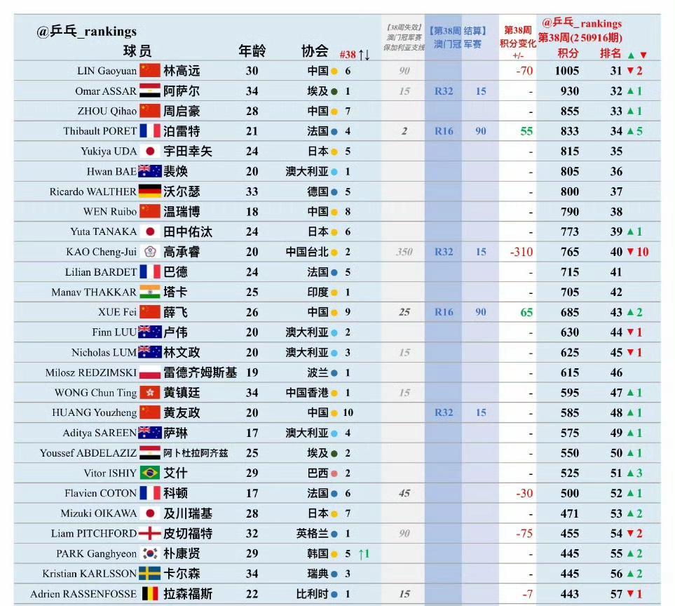 世界乒联第38周男单世界排名发布,如图所示。 本周选手们要加上2025wtt澳门