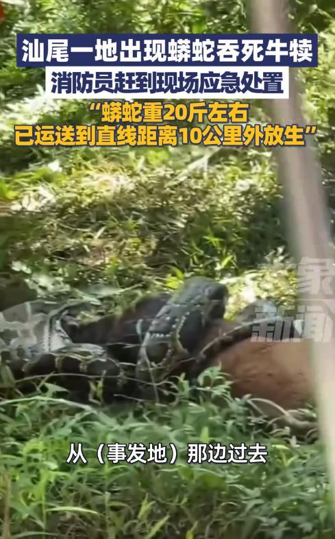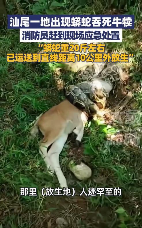 “太吓人了!”近日,广东汕尾,一村民见小牛犊迟迟没回家,就到山上找牛,意外在草丛中听到“窸窸窣窣”的声音,村民循声找去,竟然看到一条巨蟒正在吞食牛犊!消防员赶到后将蟒蛇制服,然后带到合适的地方放生了。网友:蟒蛇的天敌是什么? 每年的春夏秋天,都是蛇类活跃的季节,尤其是夏天,因为气温的原因,蛇类会寻找凉爽的地方避暑,因此经常会溜进村民家中,而到了秋天,它们又开始为了冬眠而大量捕食。 据媒体9月16日的报道,当天,村民如往常般将家中的牛群赶到山上吃草,可是牛群吃饱返回后,却少了一头小牛犊。村民在家中左等右等,最终决定上山寻找。 在茂密的草丛中,村民听到一阵怪响,便走了过去查看情况,发现一条数米长的大蟒蛇正在慢慢吞食牛犊,吓得他立马报了警。 消防员迅速赶来将蟒蛇成功制服,称量后发现有20斤重,然后带到了十多公里外放生。 蟒蛇一旦长大,在自然界中的天敌就会减少,对于小牛和羊来说,都是它们捕食的对象。 在野外遇到蟒蛇后,一定要保持冷静,如果对方没有发现你的话,可以慢慢后退,然后转身快速逃离。如果蟒蛇已经锁定了你,可以尝试向其周围扔石头、树枝来吸引注意力,再找机会逃跑。 信息来源:《9月16日采访,广东汕尾一地出现蟒蛇吞死牛犊,消防员赶到现场应急处置:蟒蛇重20斤左右,已运送到直线距离10公里外放生》大象新闻