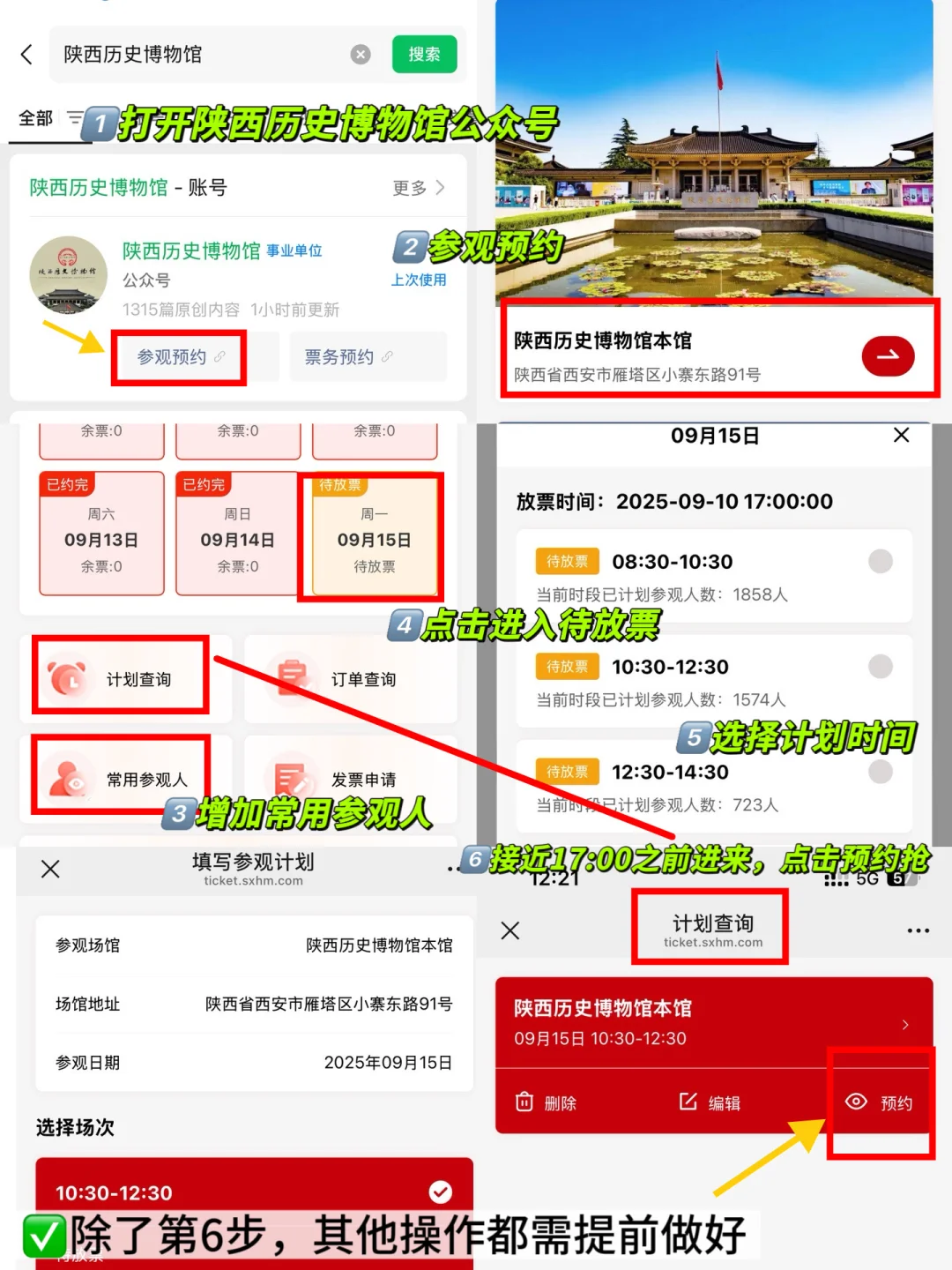 🎫门票:🆓,一定要提前5天预约,每天17:00放票,很难抢,提前把常用参观人信息填好➡️点击待放票处(填写参观计划)(具体操作指引见图3)