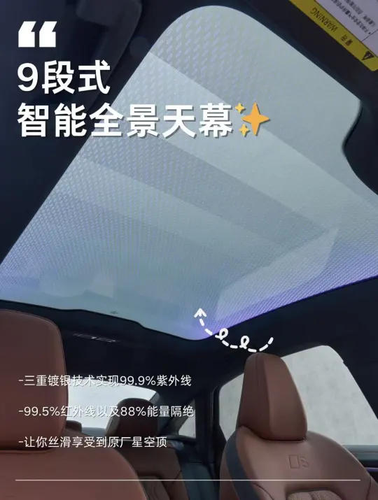 别人家车顶要么烤头要么黑漆漆 只有它!能让我白天防/晒不晒黑🌞 晚上还能看星空顶✨浪漫值拉满! 🔥9区分区调控+语音控制 说句话就能调透明度,懒人福音! ☀️99.5%红外/线隔绝率 夏天再也不怕变‘车内烤肉’了hhh 🌌102颗LED星空顶选装 氛围感直接拿捏~