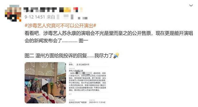 【#苏永康演唱会资料合规不等于社会认同#】涉毒艺人苏永康计划近期在浙江温州举办演唱会,遭网友投诉,引发关注。9月15日,浙江有关部门工作人员接受媒体采访时说,苏永康演唱会报批资料合规,但他们确实接到了民众有关演唱会的反映。#涉毒艺人苏永康将在温州办演唱会#