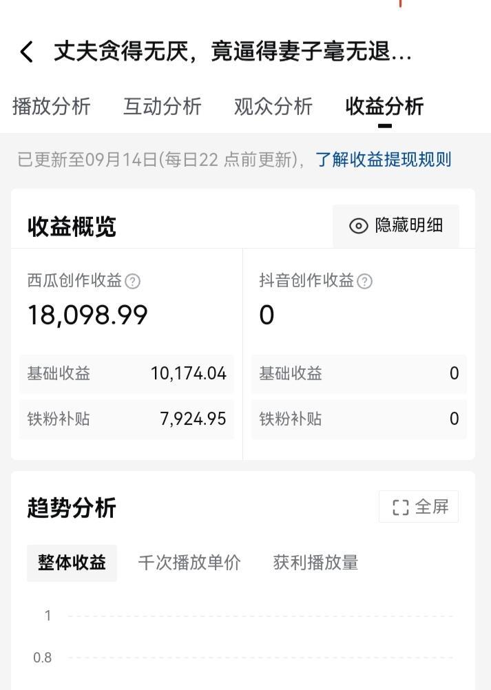我是如何做到一条视频赚18098的,用时4个小时,相当于别人3个月工资!今天就公开我的做法。 别不相信,不信的可以去下载个西瓜视频,看得到我公开的视频。我将公开制作的步骤! 首先是找素材,我会选这种素材的原因有以下几点,首先素材有一定的稀缺性,同质化太严重的素材不但不会推多少流量而且单价也低。 所以我找的是老片,而且是宝岛地区的片子,不知道大家有没有看过,玫瑰瞳铃眼系列的一个故事,讲的是有关夫妻,出轨,伦理,犯罪,这类的片子,中老年最爱看,而我的粉丝大部分是40岁以上的,所以粉丝观看的也多,铁粉带来的收入也非常可观! 接下来就是写文案了,也是很多人头疼的地方,文案功底决定视频质量,很多人都写不出好的文案,所以不敢做影视解说,而我的文案就有点取巧了。 因为玫瑰瞳铃眼系列片会有旁白,只要把旁白记下来,再修改一点就可以直接当文案了,可以用视频转文字软件,把台词全部记下来,然后去编辑就方便很多,一般文案保持在五千字左右。 之所以保持在五千字,首先是旁白差不多这字数,最重要的是长视频的单价比短视频要高得多,而且这种时长的视频也有一定的稀缺性,容易爆流量。 文案写好了,当然不用自己配音,用配音软件即可,然后把音频导出,一起放到剪映里剪辑,最基本的要求保持解说与画面同步,如果这都做不到那直接放弃算了,这也是最费时的地方,最后根据剧情选一个合适的bgm,这样一条解说视频就做好了! 最后关键的来了,那便是标题,不得不说标题是灵魂,如果太夸张会违规,如果太规规矩矩又不会吸引人,所以标题最好是能掌握好一定的度,还要和视频内容有关,反正看到这标题就要有想看的冲动,然后就是配图了,配图最好是把最精彩的部分截图下来,这样会有冲击感! 接下来就等着收益了,当然也要做好互动,最好第一条评论是自己写的,能引导他人评论! 当时这条作品流量跑了一个月,那一个月我都没怎么更新作品,但每天也有五六百,不过自从西瓜中视频改了规则后,就只能转战抖音了,而抖音跟西瓜不同,它更重视的是稀缺性与文案。