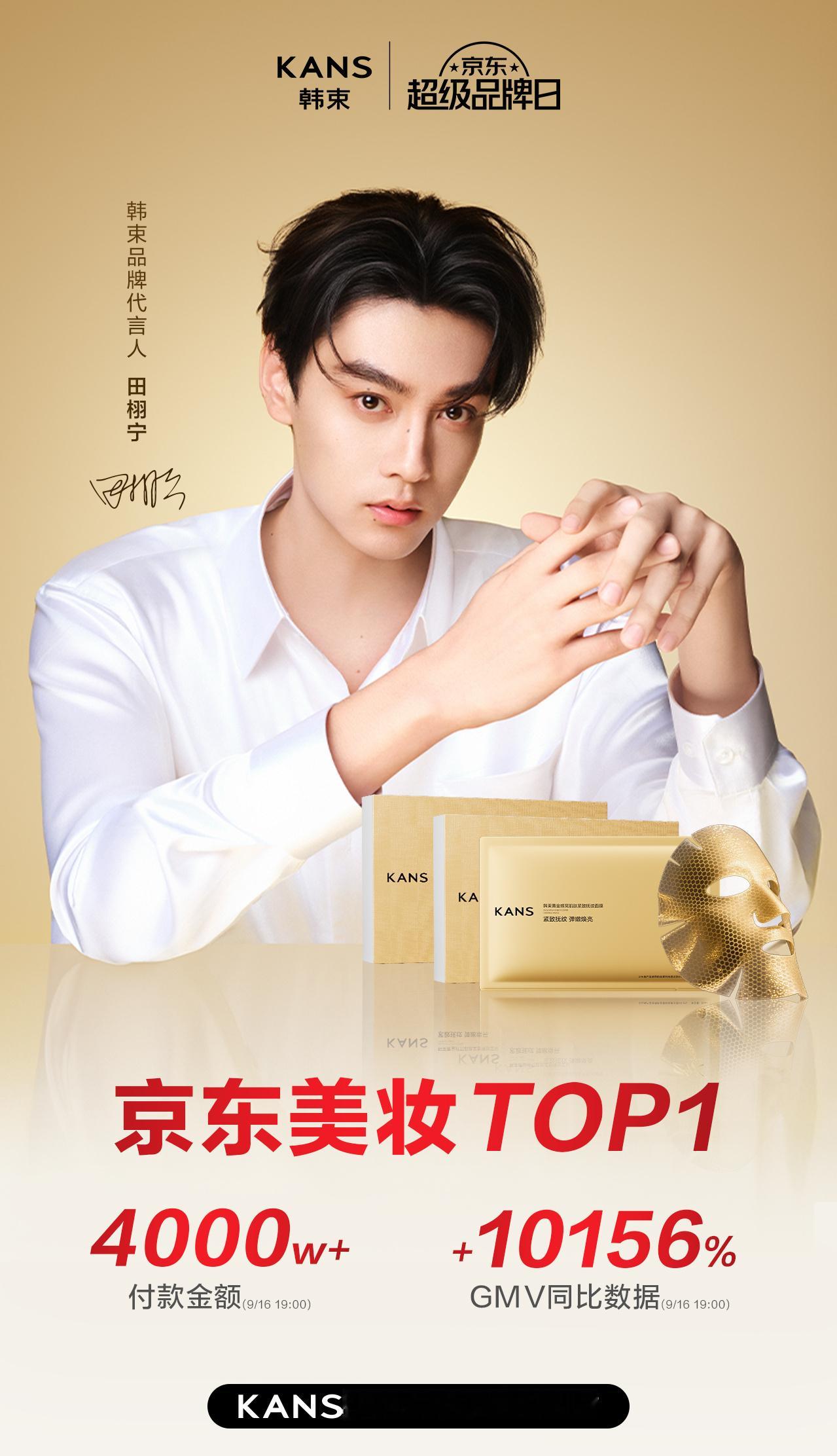 田栩宁官宣韩束单平台(京东)10h战报京东美妆TOP1付款金额4000w+GMV