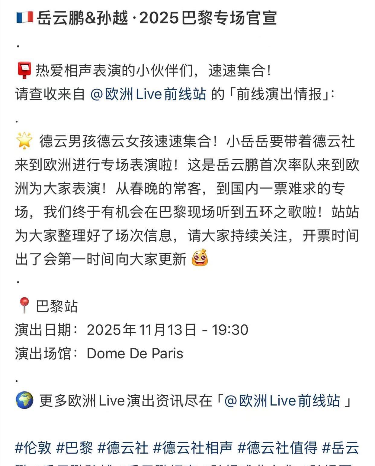 岳云鹏、孙越法国巴黎专场官宣。与伦敦专场相比,官宣的时间晚了一些,但演出的时间却早于伦敦站。根据安排,岳云鹏、孙越法国巴黎专场在11月13日,在Dome De Paris举办。伦敦站的演出在11月17日举办。既然是往前来,大家猜测,岳云鹏世界巡演第一张应该是在11月初,至于在哪个国家。多数认为,意大利,可能性很大。