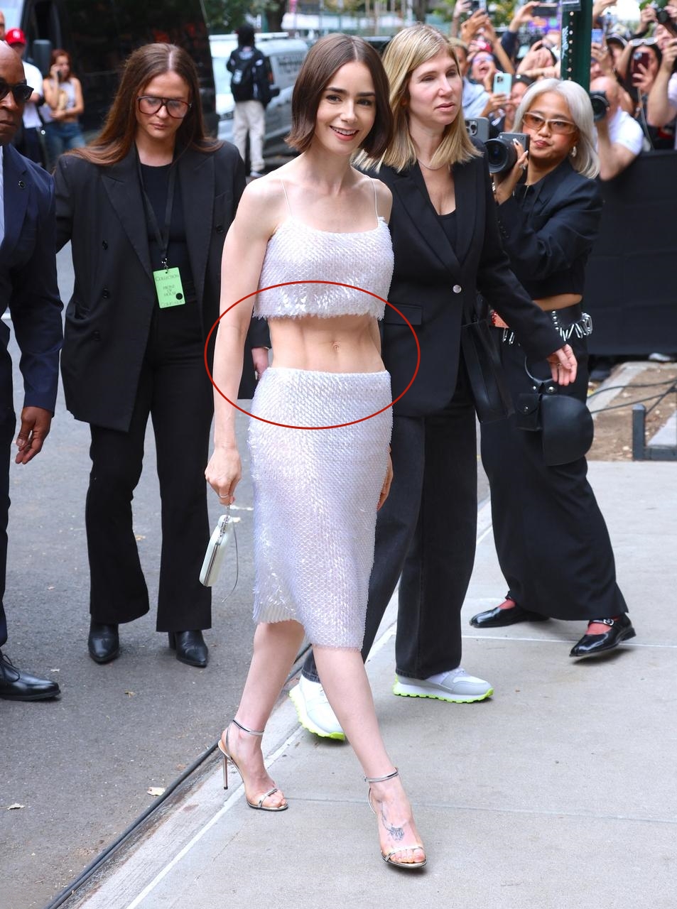 莉莉·柯林斯出席某品牌大秀,特意穿了件超短吊带上衣。 露出的纤腰足够吸睛,却也足够“惊悚”。