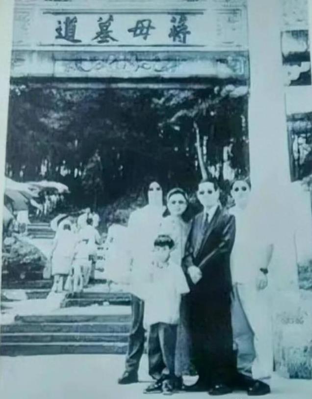 在参观完故居之后,蒋孝勇带着家人祭拜曾祖母王采玉的墓,他们在长长的墓道前留下了一张合影,一家5口中4人戴着墨镜,也是不想让别人认出他们,带来不必要的麻烦。