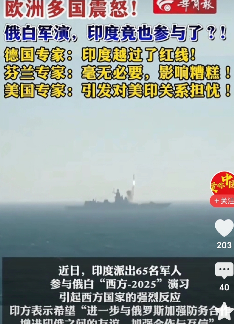 印度,真成了软柿子了 网曝:俄罗斯与白俄罗斯军演,西方瞪大了眼睛在看着,这两国以军演耍威风,气的七窍生烟,敢怒不敢言。 然而他发观了令整个西方震怒的一件事:印度竟然参加了俄罗斯与白俄罗斯的军演,成了俄、白、印军演了,这还了得。印度在特朗普眼里虽:“我虐你千百遍,你得老实围着我转”,是专供美国驱驰的。 德国专家:“印度越过了线”。 芬兰专家:毫无必要,影响糟糕。 美国专家:引发美印关系的担忧。 印度莫迪总理应反思:自认为强大无比的印度,怎么在西方眼里成了软柿子了?谁都想揑! 图片来自网络侵权即删除。