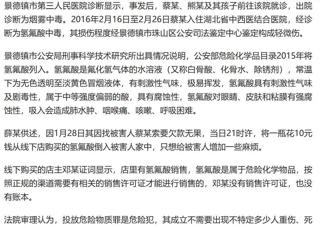江西景德镇,女子讨要欠款无果,她又苦恼又气愤,就花了10元钱买了一瓶氢氟酸,来到欠债者门前,她打开氢氟酸,撒在他们的大门上和楼道上,欠债者一家三口闻到刺鼻的味道,都中了毒。 据南方都市报,9月16日报道,薛某想起蔡女士所欠她的钱,久久没有还,她的生活受到了严重的影响,没有这笔钱,她的生活寸步难行。 当初一切都说得好好的,可欠债的却成了大爷,说不还就不还。薛某越想越是生气,谁的钱都不是大风大雨刮来的,明明是她被欠钱,她却像个孙子一样,这钱怎么要也要不回来。 她是越想越气愤,既然钱要不回来,她就要给对方一点教训。 她不知不觉就来到一家店,买了一瓶10元的氢氟酸,就来到的蔡女士家。 薛某还尝试着敲蔡女士的门,好让她开门还钱,可来到蔡女士家,敲门也没见人开门。 她这才下定决心,要让这一家人受到一点教训,她便打开瓶子,毫不犹豫地将氢氟酸撒到蔡女士家的大门上,氢氟酸随着门板又流到楼道上面。 瞬间,一股刺鼻的味道充斥着整个楼道,薛某知道这刺激的味道是很可怕的,她赶紧捂住鼻子,快步地离开了现场。 来到小区的草坪上,她回头看了一眼蔡女士家,依然是愤愤不平,她随手将那氢氟酸的空瓶扔到了小区的草坪上。 那时蔡女士一家人正在家中,他们很快闻到一股刺鼻的味道,是从大门传来,这股味道让他们难以待在家中,这才开门看看外面的情况。 结果他们看到楼道有大量的烟雾,瓷砖上还冒着泡,那味道更刺鼻了。 蔡女士一家人马上意识到,这可能是硫酸,他们穿好鞋子赶紧离开了家,而那些烟雾也触发了烟感报警器,物管的人也以为这是硫酸,蔡女士这才意识到问题严重了,她赶紧报了警。 这件事情发生后,蔡女士的丈夫感觉身体很不舒服,就去看医生,医生也看不出什么问题。 虽然医生看不出什么问题,但蔡女士的丈夫就感觉自己很不舒服,他回到小区,越想这件事越觉得不对劲,他觉得自己身体不舒服,和昨天闻到的刺激味道应该是有关系的。 他就在草坪上走来走去,一边走一边思考这件事情,结果走着走着,他就捡到了一个瓶子,他闻了一下那瓶子上的味道,跟昨天闻到的刺激味道是一样的,他又看了一下瓶子上的字,上面赫然写着氢氟酸。 看到这几个字,他瞬间吓得腿都软了,他很清楚氢氟酸实际上就是化骨水,这是非常危险的化学品,就算是闻到味道,也会对人的产生危害,更别说人的皮肤触摸到这些氢氟酸了。 一旦人的皮肤触碰到这些氢氟酸,不但皮肤会被腐蚀,它还会深入骨头,骨头也会被腐蚀,慢慢的,人的生命都会受到威胁。 现在他闻了那么多这些刺激的味道,难怪他感觉非常不舒服。 发现这些刺激气味到底是什么东西之后,蔡女士一家三口赶紧去就医,他们都被诊断为烟雾中毒了。 还好他们当时是穿着鞋子的,如果没有穿鞋子,脚接触到这些氢氟酸,后果真的不堪设想。 也幸好当时发现这些刺激的味道之后,他们报了警,他们和物管也及时清理了这些氢氟酸,这才没有造成更大的危害。 事情发生之后,薛某说,他只是想给蔡女士一家增加一点麻烦,好让他们赶紧还钱,她没想过这氢氟酸会有这么大的危害,毕竟这只是她10元钱轻松买来的东西。 那么如何认定这样的事情呢?
