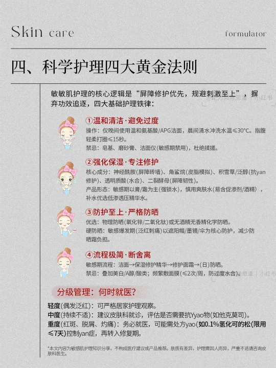 严格遵循以屏障修护为核心的极简护理原则,是重建皮肤健康生态的关键。只有quan面了解敏感肌的成因、类型,精 准识别症状,实施科学护理与分级管理,才能逐步改善敏感肌状态,恢复肌肤的健康与活力哦。