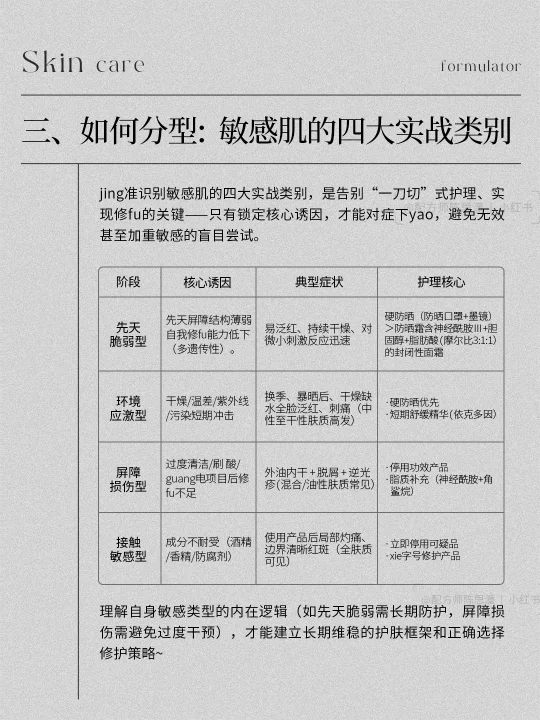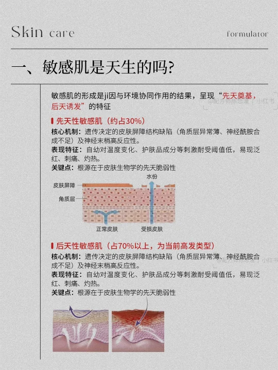 敏感肌并非单一肤质类型,而是先天体质、后天护理失当及环境压力交织作用的结果,其管理需建立在对机理的认知上,明确区分敏感肌与过敏肌是有效干预的前提。本文将从成因溯源、类型细分、核心鉴别及科学护理四大维度,系统解析敏感肌的管理逻辑。