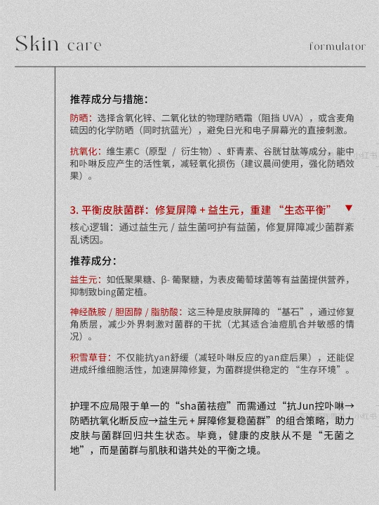 对配方设计而言,终 极目标并非 “消灭 Jun群”,而是通过成分的科学配伍,让产品成为皮肤微生态的 “平衡调节器”—— 既精 准干预卟啉过度产生的问题,又赋能皮肤自身的菌群调节能力。这,才是从根源解决油痘肌反复问题的配方哲学。