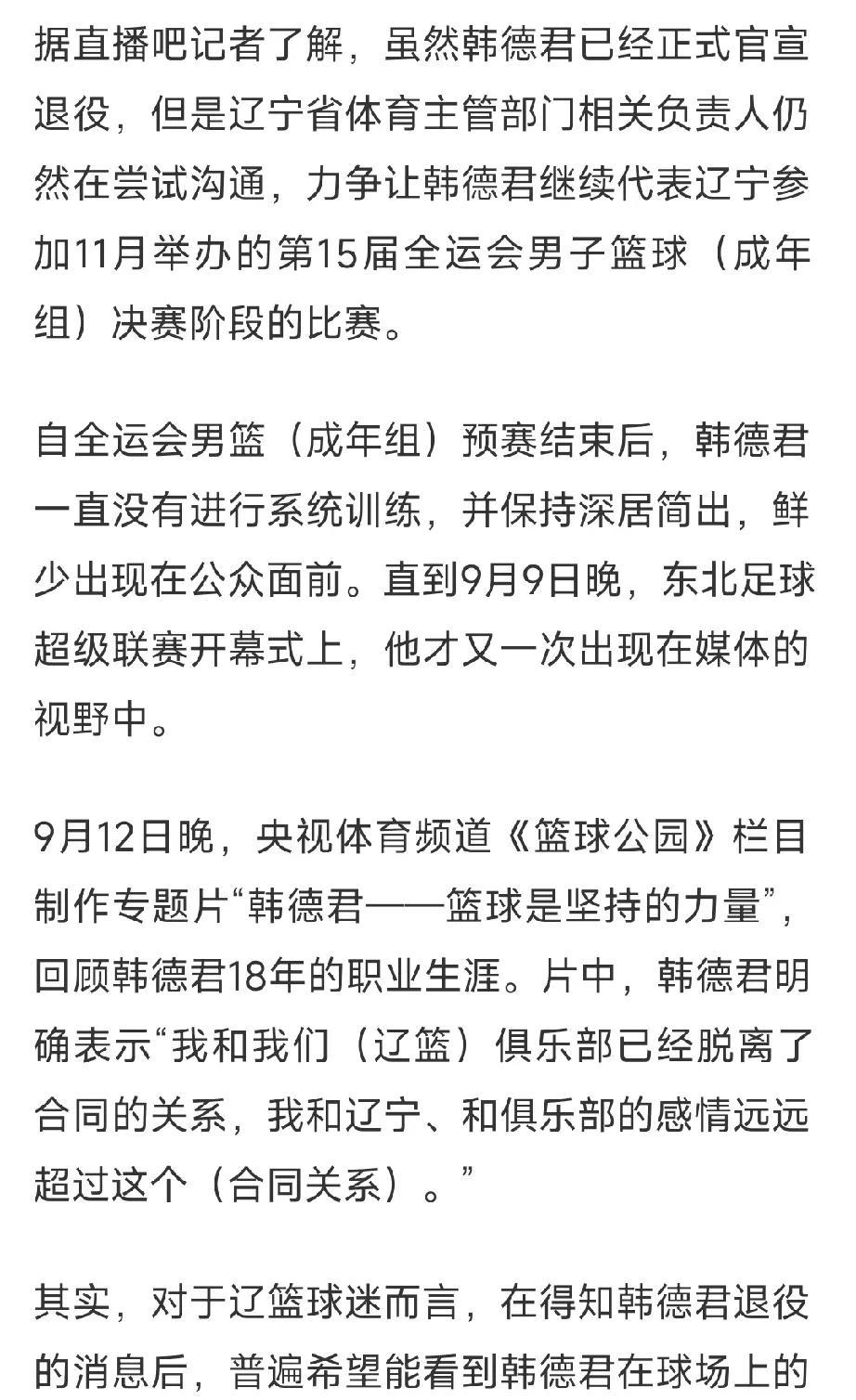 辽宁体育局让大韩打完全运会,大韩:我和俱乐部已经脱离关系了! 大韩目前已经宣布退役,并且大韩已经和辽宁男篮俱乐部没有合同关系了,大韩最近也没有训练,基本消失在了公众视野,直到东北足球超级联赛才看见大韩的身影。 虽然已经宣布退役,且和俱乐部没有合同关系了,但是辽宁体育局仍然希望并且和大韩商量能否打完全运会。 大韩在采访中说,我和我们俱乐部已经没有合同关系了,但是我们的感情胜过合同关系! 以大韩的性格和对辽宁男篮的感情,我觉得大韩会为辽宁队打完全运会!
