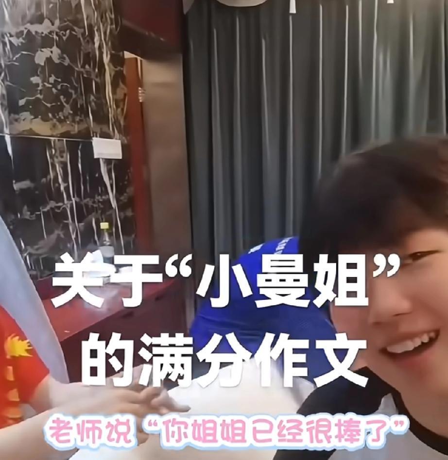 小曼姐的妹妹蒯捷好可爱,写作文直接写“姐姐输给了孙颖莎”,哈哈! 蒯捷小妹妹你知道吗,可不是谁都能打到孙颖莎面前的,老师评语都说了你姐姐已经很棒了。 不过蒯捷妹妹还不忘鼓励姐姐,“我的姐姐还要加油”。相信你姐姐会继续努力加油的,她要追赶孙颖莎的。
