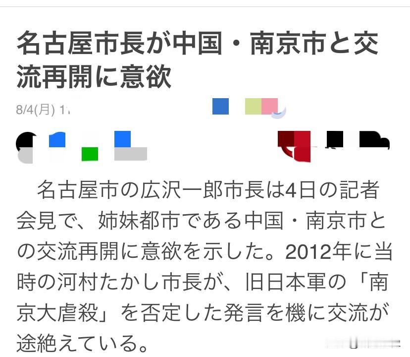 据日本媒体报道: 日本名古屋市长“广沢一郎”在 媒体上发表了要同姊妹城市中囯 南京恢复正常交流,重启友谊之 交的意愿。 2012年,因为当时的名古屋市长 “河村高志”张口否认「南京大屠杀」 的真实性而导致两大城市的国际化 交流中断至今未恢复。 想知道南京市民们的心声,望头条 平台传达和大家的真诚建议。
