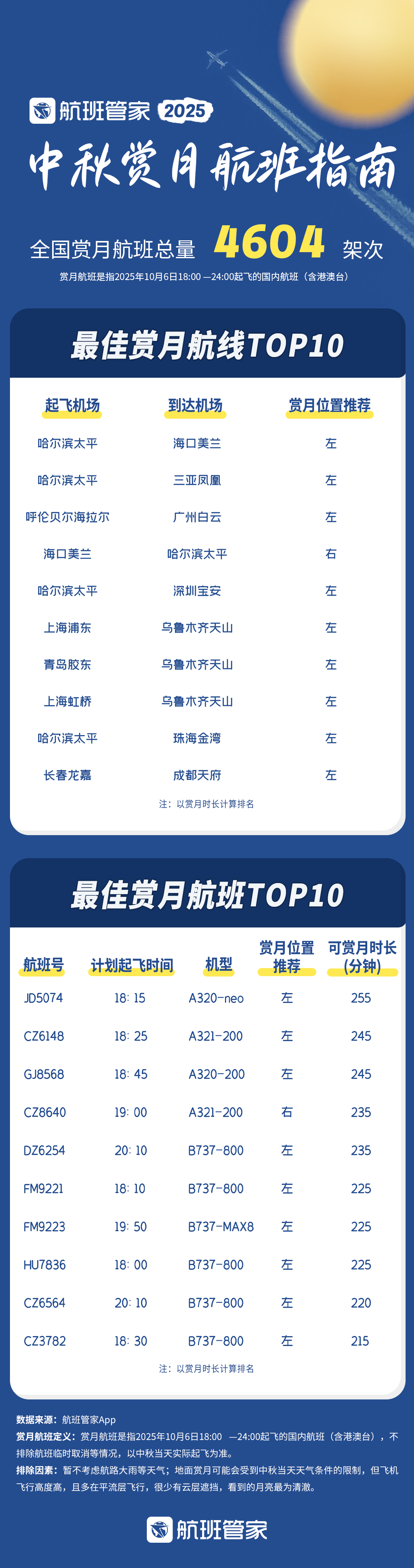 上证报中国证券网讯(记者陈梦娜)根据航班管家App,2025年10月6日(中秋节)18:00至24:00期间,全国共有4604架航班适合赏月。其中,最佳赏月航线为哈尔滨太平至海口美兰,推荐旅客选择机舱左侧靠窗位置。