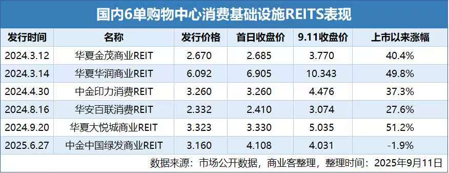 从目前已入市的6单购物中心REITs二级市场表现来看,价格基本处于上涨趋势,其中华夏大悦城商业REIT涨幅最高,超50%,而华夏金茂商业REIT、华夏华润商业REIT涨幅均超过40%。