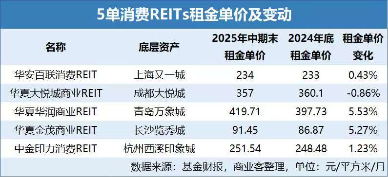 若从租金单价变化方面来看,上半年除成都大悦城的租金单价有小幅的0.86%下滑外,其余5个底层资产的租金单价均实现上涨,其中华夏华润商业REIT的青岛万象城涨幅最高,由2024年底的397.73元/平方米/月,涨至2025年6月底的419.71元/平方米/月,涨幅为5.53%。