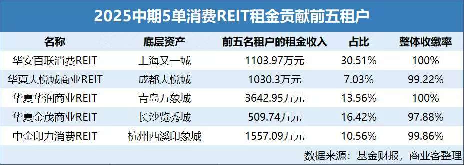 其中,租户集中度较低的是成都大悦城,单一租户占比均未超过5%,前五名租户的租金收入占比总计7.03%,不超过10%。