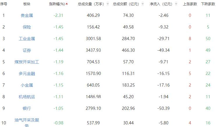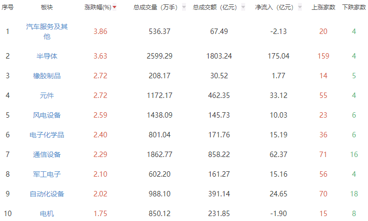 板块方面,汽车服务及其他、半导体、橡胶制品、元件等板块涨幅居前,贵金属、保险、工业金属、证券等板块跌幅居前。