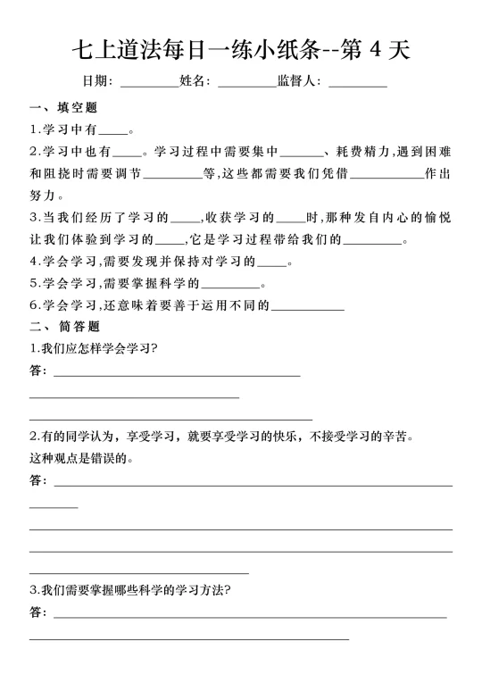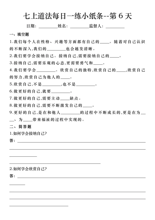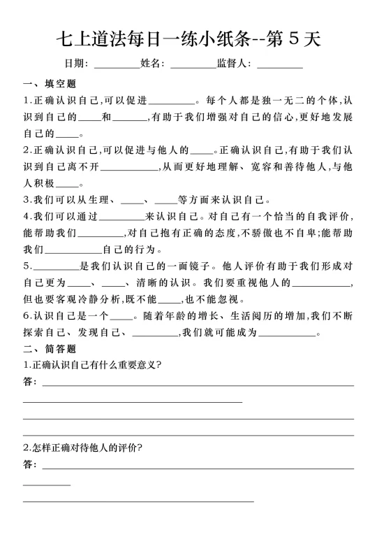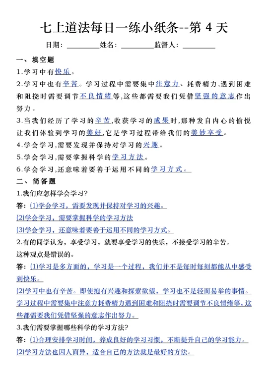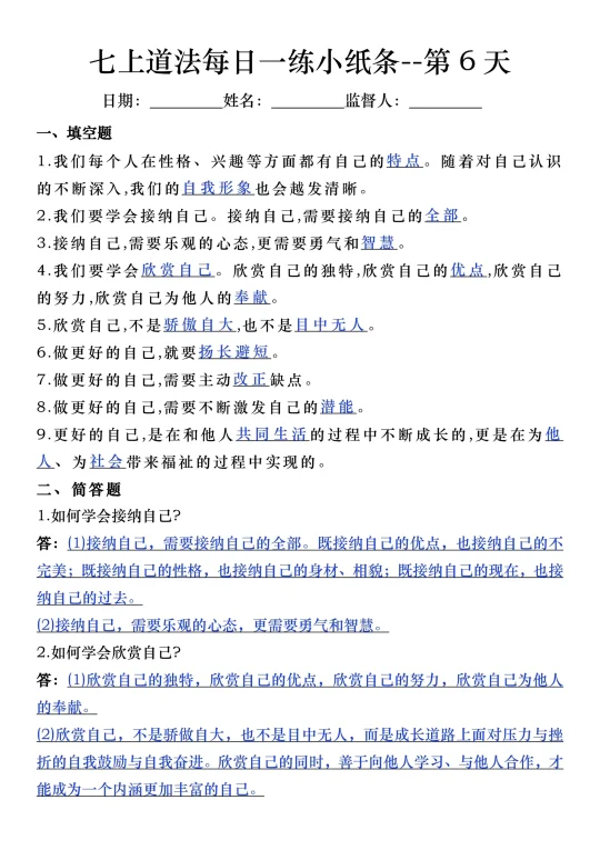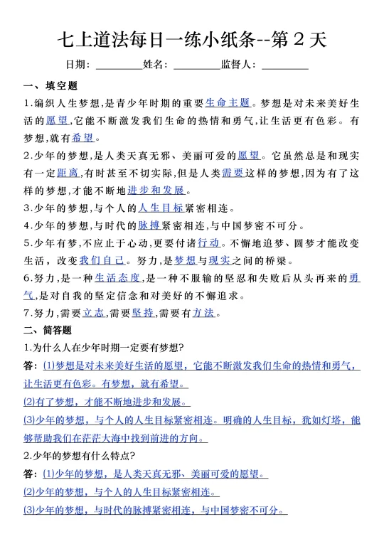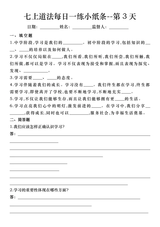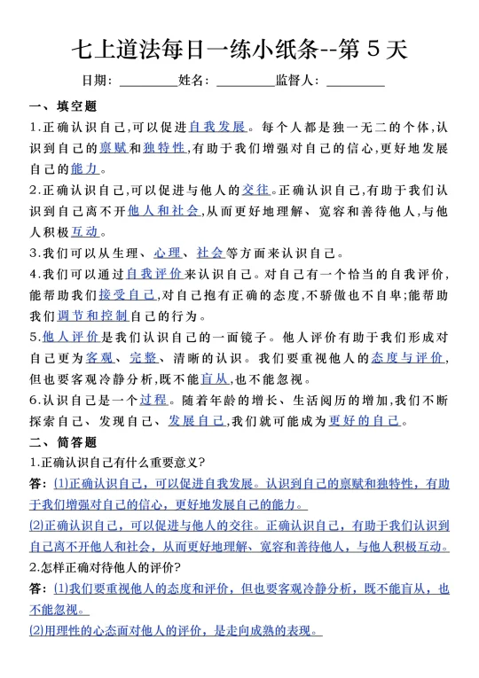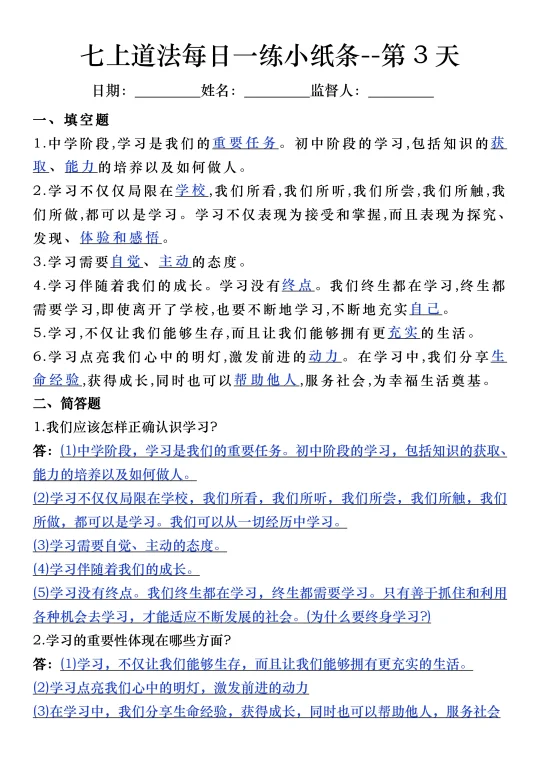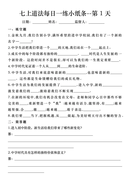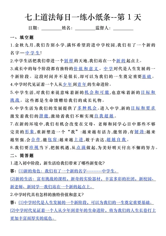 初中道法 考点速记 初中道德与法治 道法 知识点总结 七年级上册 七年级道法 七年级上册道法 初一道法 默写小纸条
