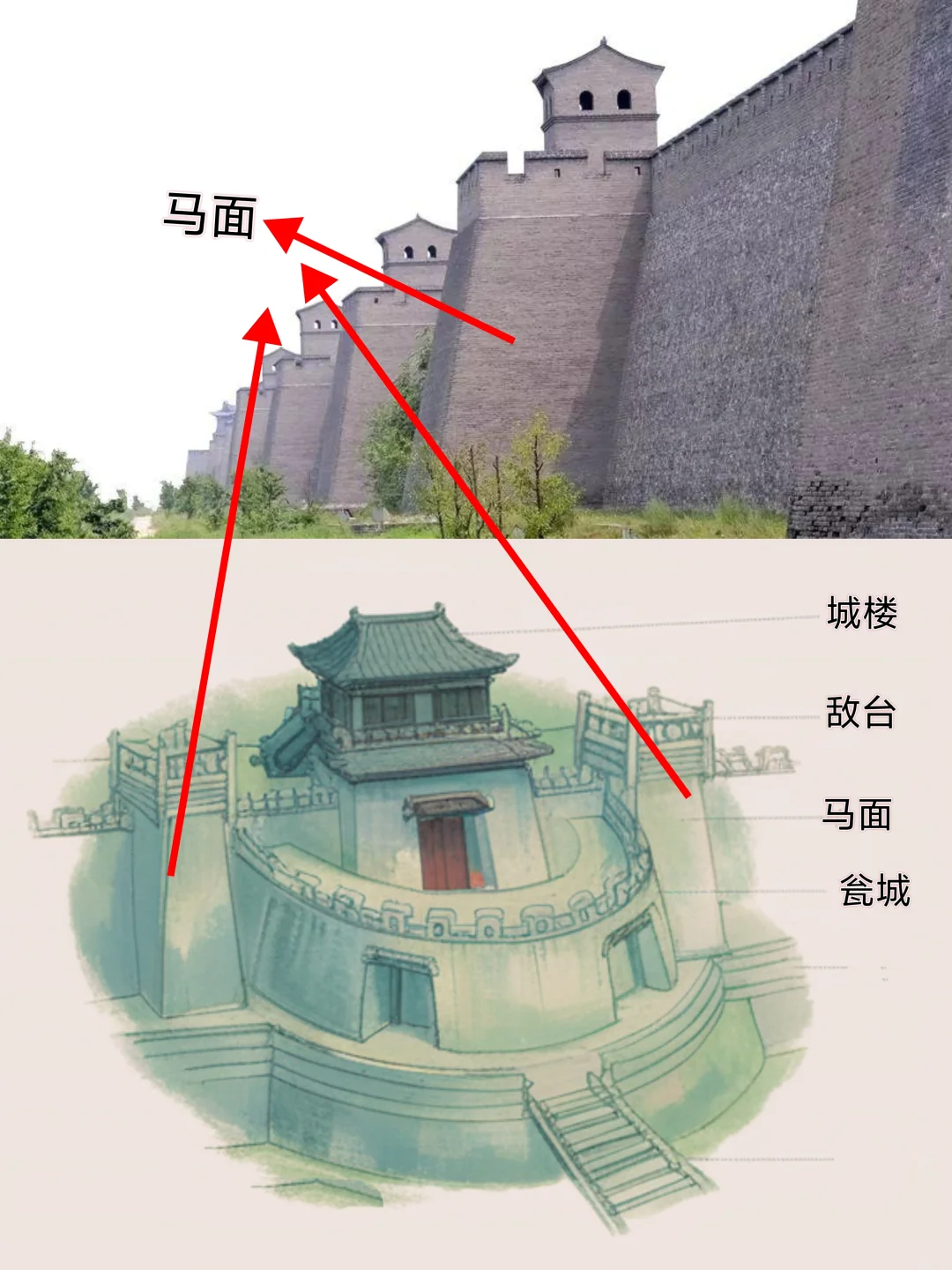 1⃣️马面的意思来源于马面墙,也叫支墙, 是从城墙上延伸出去可达一二百米长的完整墙体,两侧皆面接入侵方向,可以囤积较多兵力与主墙形成交叉火力。
