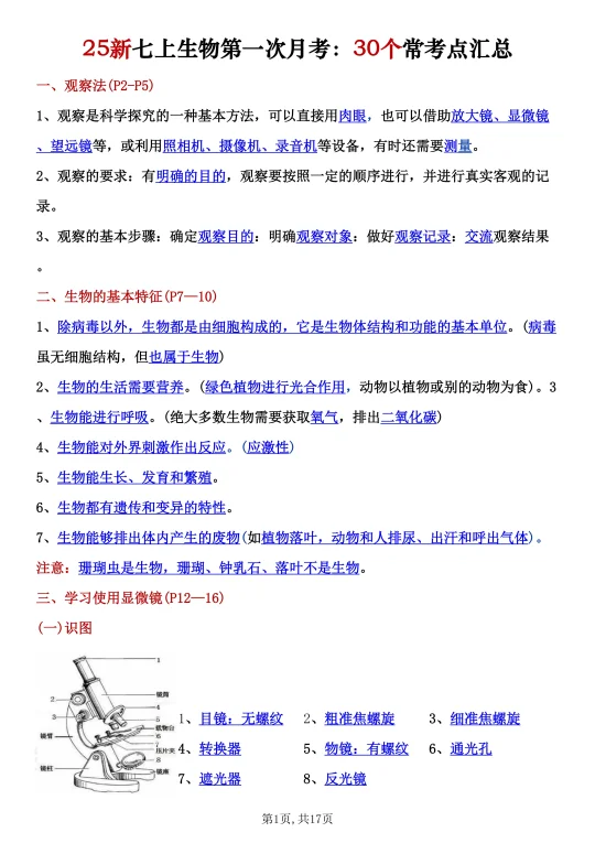 学渣逆袭指南 家长收藏孩子受益 必考考点 初中生物 第一次月考 七年级上册 考前押题 初中学习方法 孩子教育 七上生物