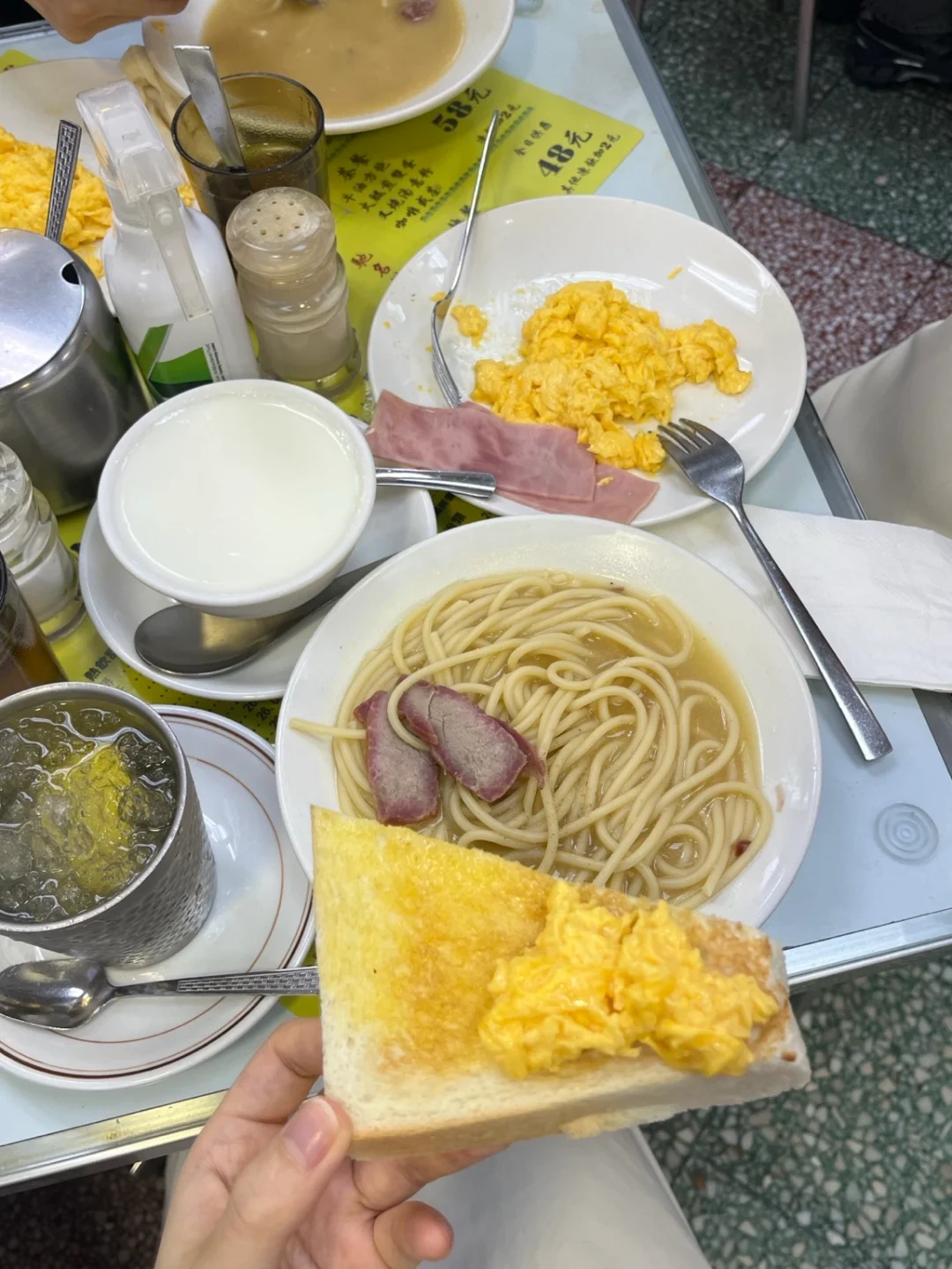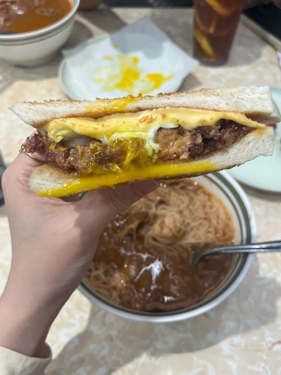 元朗名物。一般我不爱吃茶餐厅的,这家的沙爹牛肉面确实香,但吃到最后会有点咸。更惊喜的是它家的咸牛肉芝士蛋三明治!烘底一下,绝了。4.9星。