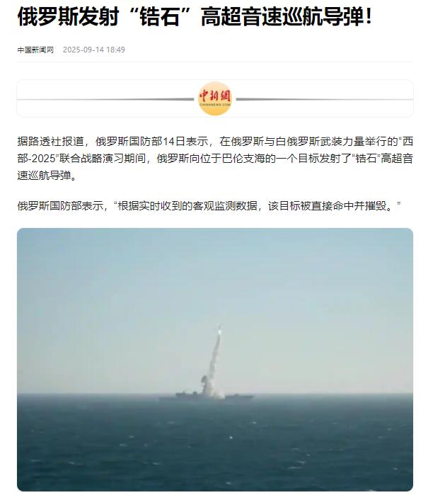 [微风]俄罗斯背后还有绝招?据路透社报道,俄罗斯国防部14日表示,在俄罗斯与白俄罗斯武装力量举行的“西部-2025”联合战略演习期间,俄罗斯向位于巴伦支海的一个目标发射了"锆石"高超音速巡航导弹。 这个消息一爆出来,西方军事观察家们再次集体头皮发麻,原本乌克兰战场的数据还在引发一场关于俄军武器“吹得玄乎、实战堪忧”的讨论,没想到演习场上,俄罗斯直接祭出了不一样的狠货。 其实最近有关俄罗斯高精尖武器表现的争议挺热闹,比如说,被号称“远程精打”的“口径”巡航导弹,在乌克兰被防空系统拦得节节败退。 “匕首”高超声速导弹,传说中“无法阻挡”,也有一小半被揪下来。 这些数据让不少西方分析师心里直犯嘀咕,难道俄军的那些神器只是展厅里看着酷,真刀真枪上了战场就蔫了? 但这时候“锆石”出来了,画风瞬间变了,现场消息是,这枚“锆石”飞得快得离谱,每秒近三公里,直接给北约海军的防空反应链按下了“暂停键”,几乎没时间拦截。 很明显,俄方这就是故意摆个“王牌”,让对手看看家底儿,并不是所有厉害武器都用在乌克兰这样的“缓冲区战场”。 在乌克兰,俄军案板上的,是成本优先、老旧型号和大批改装滑翔炸弹,而对付北约,那些顶级高超音速武器才是保留节目。 其实这背后是一套双轨战略,说白了,乌克兰是一场“省钱消耗战”,俄军乐意用低价、能凑合着用的东西,一边压制一边省着打,对乌克兰来说,这持续的敲打不光费钱,更磨掉了不少士气。 而真正针对西方、北约,俄罗斯手头上的“锆石”和更吓人的“榛树”才是底牌。 这些武器速度快到离谱、威力大到让人不敢想,部署在本土附近,一旦开火,一些欧洲大国首都根本来不及反应。 “榛树”还有能力带核弹头,普京还专门“官宣”:这种家伙已就位,谁敢试探便真可能擦枪走火。 所以俄罗斯其实是把乌克兰战场当做展示“耐力跑”,而把真正的“百米冲刺”藏着,专门用来威慑北约。 其实这套玩法给西方出了个大难题,一边不住加码援助乌克兰,但俄军耗得起,西方花大钱却换不回战略突破。 一边又不敢直接硬碰俄罗斯的底线,生怕把对方压急了,被“锆石”和“榛树”敲山震虎。 所以现在欧洲的安全格局等于被这套“威慑迷宫”彻底搅乱,俄罗斯用层层递进的武器组合,让西方明白,你看到的,只是表面,真正狠的牌,都还在手里攥着!
