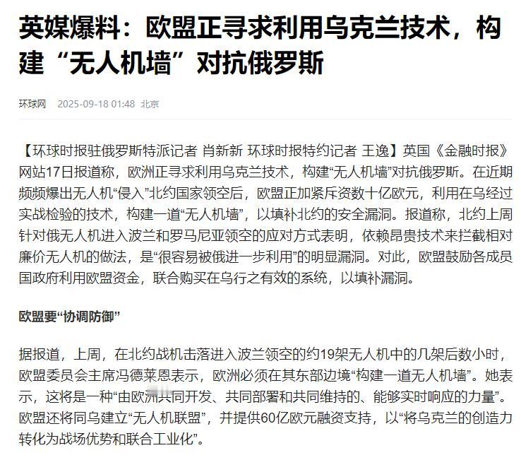 [微风]欧盟要防俄罗斯,居然得靠还在打硬仗的乌克兰递技术?英媒爆料称,欧盟正琢磨砸钱搞“无人机墙”,核心本事全是乌克兰在战场上练出来的真招。 事情的背景不简单。俄白刚收尾一场十万人规模的大军演,战车、火炮密密麻麻地铺到边境线上,普京还亲自跑去看阵势。虽说表面是防御演练,在欧洲人眼里却像是摆明了秀肌肉。紧挨着俄罗斯的波兰立刻紧张起来,急调边防部队,还试射了新防空系统,生怕局势一夜翻盘。 北约也没闲着,一个叫“东部哨兵”的应急部署很快拉响。英国、法国、丹麦都派兵派装备赶去东欧撑场面。但表面热闹,里面问题不少——各国带的装备型号五花八门,指挥各管各的,联合演练更多是走流程。真要在实战里应付突发攻击,这样的配合打不出最佳效果。 美国这边的打法也变了。以前援乌的钱和武器基本是它来兜,现在让欧洲出更多资金,自己则动库存武器来帮忙。乌军虽然还能接收到支援,但等于欧洲对美国的军事依赖更深了。这对那些喊着要减少美方插手、增强欧洲自主防务的人来说,可不是什么好消息。 就在这种气氛下,欧盟抖出个新项目——砸六十亿欧元建一条虚拟的“无人机墙”。别以为是混凝土围墙,它由监测传感器、反无人机设备和数据网络组成,更让人意外的是,核心技术出自乌克兰,是在前线一次次真刀真枪干出来的经验。立陶宛已经组建了机动小队专门抓无人机,拉脱维亚则在边境布满了传感器。 听着很美,但项目一上路就卡了。成员国的技术标准各有一套,系统互不兼容,数据也没法顺畅共享。原本想织成一整张防护网,结果变成了几块各自为战的拼布。 这种尴尬不是书面推测,而是现实早就提醒过他们。去年,俄军的廉价无人机闯进波兰领空,波兰和北约直接用高价防空导弹硬拦。虽然打下来了,可一算账,成本比例离谱,反应速度也不算快。要是碰上大批量突袭,这种防守模式必然吃不消。 说到底,欧洲的短板不是没装备,也不是没技术,关键是合作这根筋一直绷不住。有人有高端雷达,有人反制无人机的手段走在前面,但真到要合成一套系统,各国顾虑多、标准乱,谁也不肯让步。“无人机墙”号称整合全欧防御力,可内部协调不畅,让好好的计划变得举步维艰。 如果还这么拖下去,不管花多少预算、堆多少硬件,边境防线都不会稳。俄罗斯的步伐没放慢,欧洲却在开会讨论规则、琢磨标准。与其一味砸钱买设备,不如先把协作上的梗堵了。毕竟,真有危机来的时候,能全速联动、资源信息无障碍共享的团队,才是真正的防御墙。