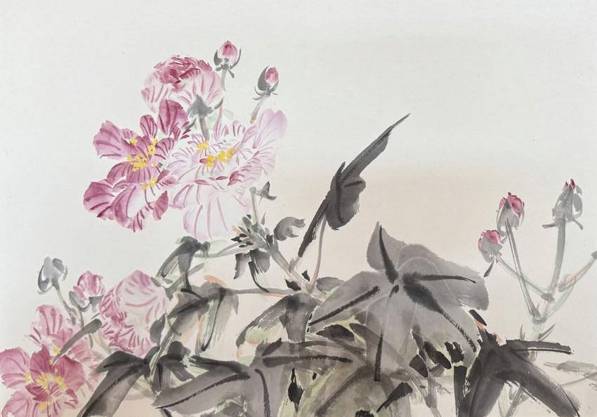 借鉴恽寿平、任伯年没骨技法,以“分层点染”表现芙蓉花瓣空气感——淡色打底、重色提点,花丝勾绘注重疏密。枝叶按“主枝向下、副枝补苞”的主副势布局,掌形叶兼顾多角度形态,勾脉不接死中心学明代陈淳虚灵特质,最后以淡绿、赭石晕染营造秋意,通过调整空白节奏强化画面平衡。