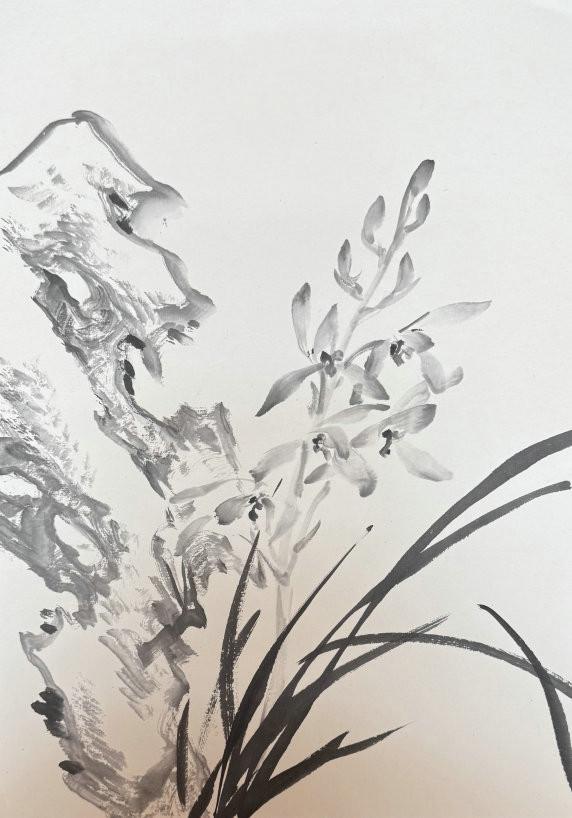 选用油烟墨创作,笔尖蘸重墨实现墨色渐变,利用生宣渗化特性表现兰花水润感。枝叶以“虚接显空灵、实接定结构”的笔法绘制,补画湖石时采用山水画折带皴,保持“石为配景、墨色弱于兰花”的主次关系,最终通过“淡墨显层次、重墨点精神”,呈现文人画的清雅意境。