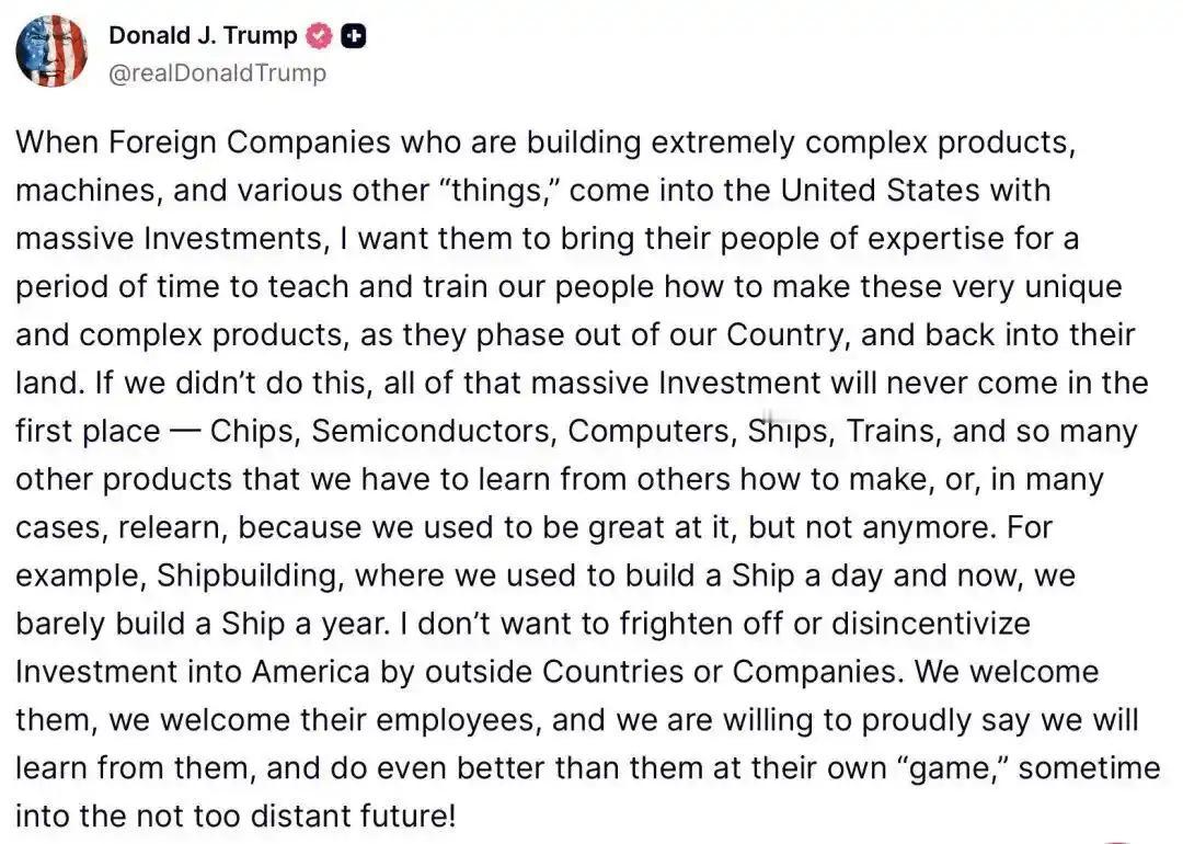 [微风]中美在马德里第4轮交锋,特朗普发出长文,罕见承认美国制造业落后 这话一出,让不少人愣了一下,毕竟这位当年拼命喊着要把工厂拉回美国,让工业复兴,如今却直言“实力不行”,着实罕见。 他不是随口抱怨,而是拿现实举例,比如汽车行业,福特在搞电动车工厂时,不仅没多招人,还裁了几百人,电池技术还得靠中国的。 甚至有企业想把玩具生产搬回美国,结果发现连修模具的师傅都找不到,零件坏了还得从中国运。 显然,不光是技术断档,整条产业链早已掰成几段,想拼回来,时间和成本都是大坑。 成本更让人头大,就算对中国商品拼命加关税,美国本土造一部 iPhone 还是贵得离谱,而且关键零件仍得从亚洲买。 没有完整链条,大型制造项目想完全落地美国,几乎天方夜谭。 反观中国,从零部件到整机,一条龙搞定,工厂自动化高,工人训练有素,配套齐全,不用到处求人。 很多美国商人说,跟中国比,这差距不止一丁半点。 聊到产业困境,特朗普顺势批评美国经济“太短视”,他提议上市公司别每季度交财报,改成半年一次,这样管理层才能有心思布局长远。 他还搬出中国作对比,说中国是“看五十年、一百年的发展”,而美国“在按季度过日子”。 不过,他显然搞错了,中国企业其实一样要发季度财报,他可能是把中国的五年规划等稳定政策,与企业的财务制度混淆了。 事实上,美国内部早有人讨论这个问题。2018 年,巴菲特和摩根大通的 CEO 就说,季度业绩压力让企业只顾眼前利润,不投长线项目。 马斯克也有相同看法,但反对的人同样不少,像前财长萨默斯就担心少了季度披露,透明度下降,投资者更难及早发现问题。 有意思的是,特朗普虽在国内口口声声让美国重回巅峰,却多次在公开场合夸中国,高铁速度、司法效率、大型阅兵的组织能力…… 他都赞不绝口,甚至说中国高铁“没有缺点”,感叹美国连影子都没有。 对他来说,中国最可取的就是政府的长期稳定规划,相比美国政策周期短、朝令夕改,更能沉下心搞建设。 制造业的衰落,其实和美国的短期思维息息相关,企业不愿在研发、技术、人才上做多年投入,核心环节不断外流。 等到想回流的时候,发现已经不是钱的问题,而是整体体系都要重建。 中国的优势就在于多年打磨出的全产业链和持续投入,基础设施、技术研发、人才培养、上下游协作,像齿轮一样严丝合缝。 这种体系不是抄两招就能复制的,而是市场规模、政策延续性和制度配合的产物。 特朗普的羡慕和焦虑,其实折射出中美现实差距。但无论羡慕还是批评,如果基于事实,才谈得上建设性。 毕竟在全球化的供应链里,中美联系得很深,少点隔空喊话,多点实地了解,或许才是真正的竞争力。 【信息来源:新浪财经2025-09-17——中美在马德里第4轮交锋,特朗普发出长文,破天荒承认美国不行了 京报网2025-09-16——特朗普又夸中国了,但这次我们真接不住啊!】