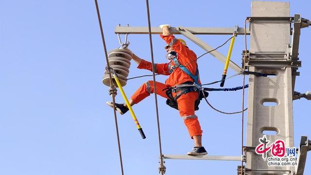 登杆作业人员对附加悬挂进行检修。王璨摄