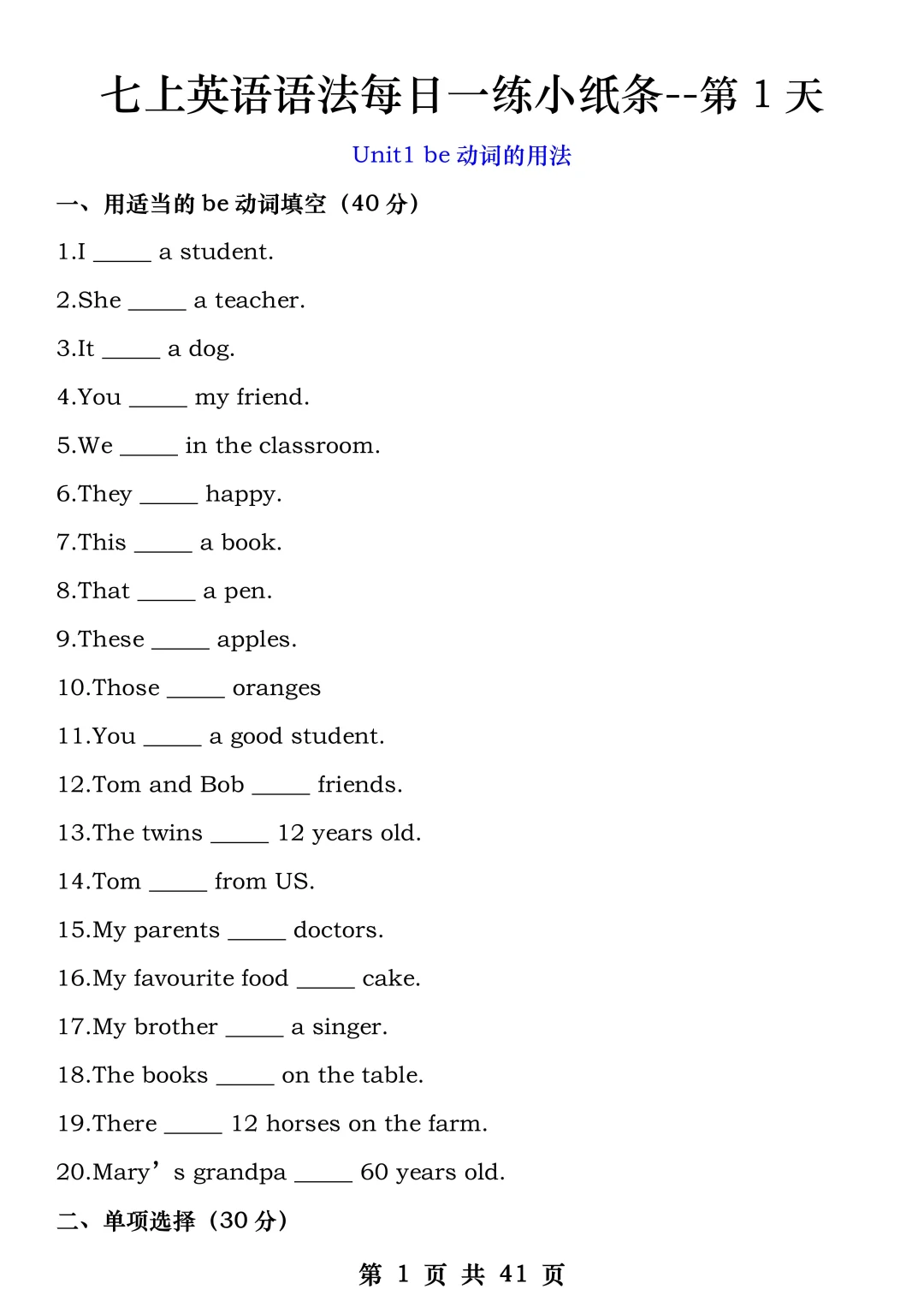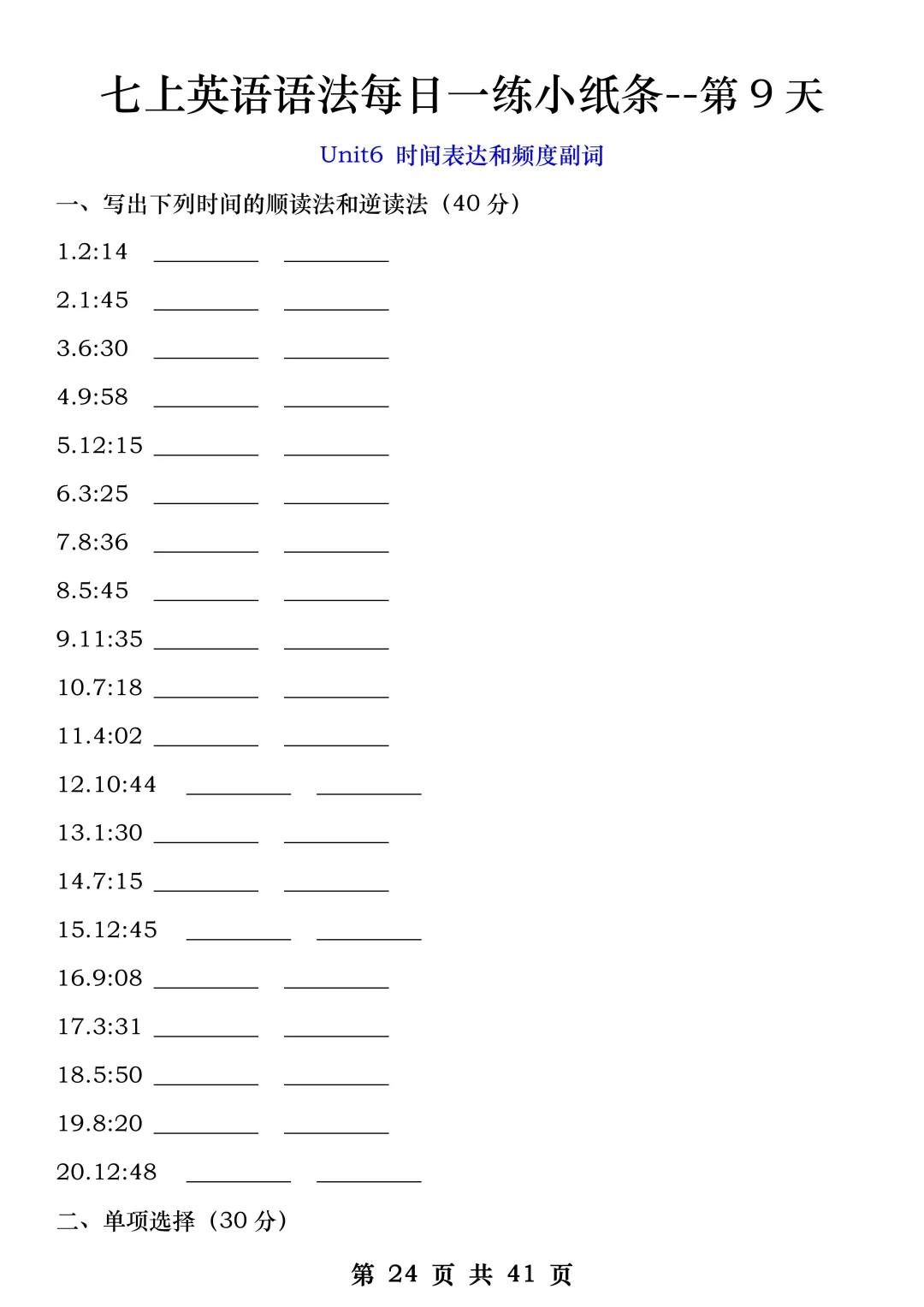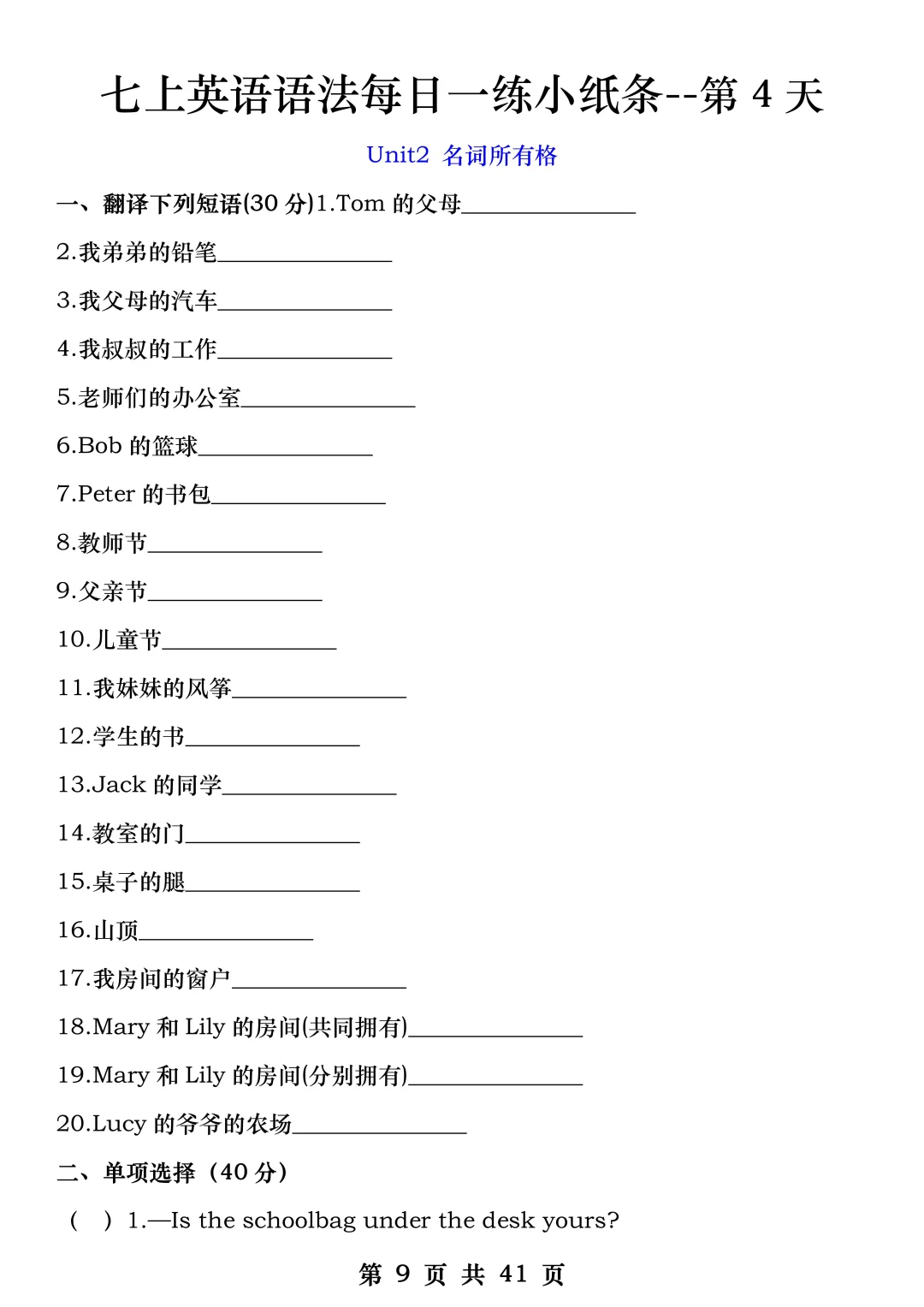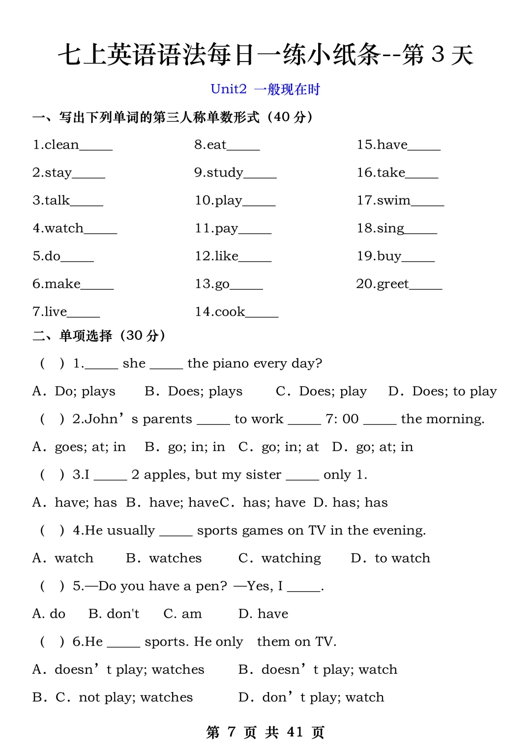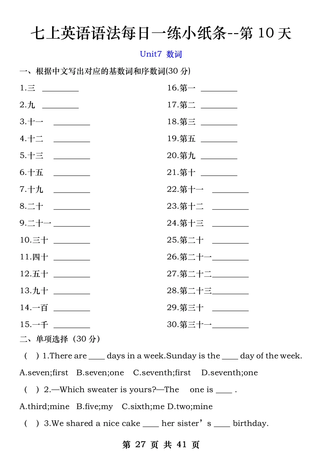 火箭班老师发的:七上英语每日一练小纸条