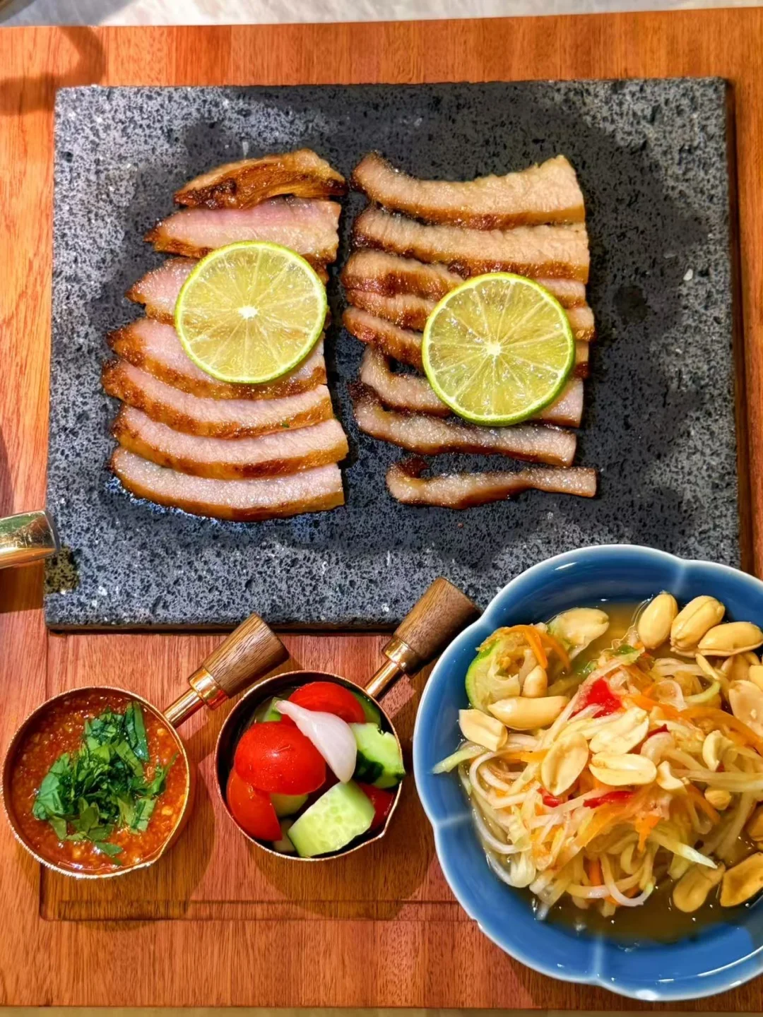“猪颈肉卷王诞生!”肥瘦黄金比,焦糖脆壳+柠檬叶熏香,蘸秘制酸辣酱一口飙汁!搭配肉碎生菜包吃出双重暴击~