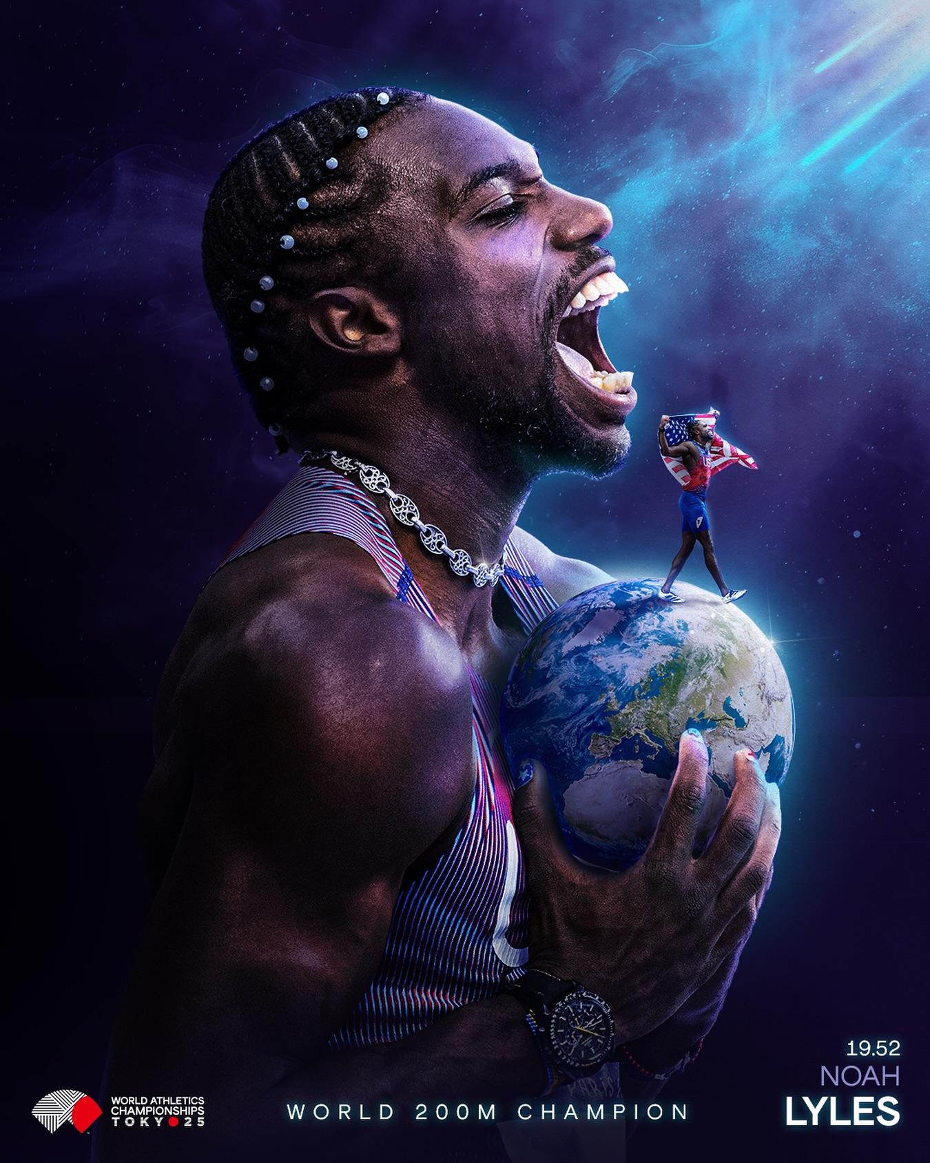 世界田联ins发布推文称,诺亚·莱尔斯⚡@nojo18强势斩获个人第4个200米世界冠军头衔19.52⏱#WorldAthleticsChamps