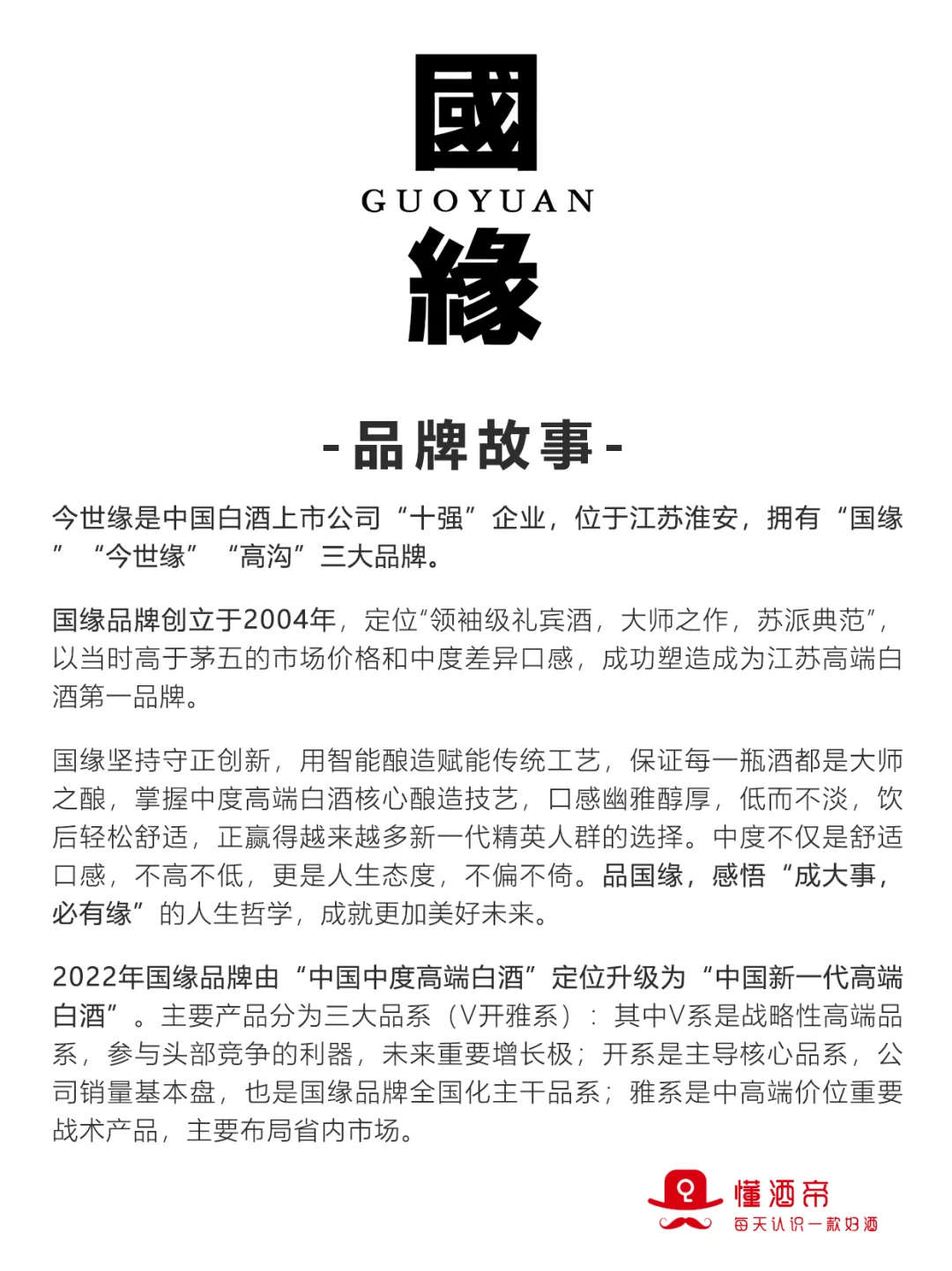 2022年国缘品牌由“中国中度高端白酒”定位升级为“中国新一代高端白酒”,延续中度口感差异特性,以“成大事必有缘,高端宴请喝国缘”为核心消费场景诉求。主要产品分为三大品系(V开雅系):其中V系是战略性高端品系;开系是主导核心品系;雅系是中高端价位重要战术产品。