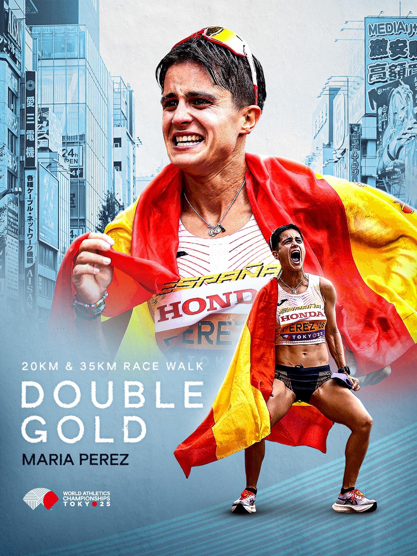 记者世界田联ins发推特报道,ELDOBLEDOBLE@mariaperez_marcha以1小时25分54秒的成绩强势夺得20公里竞走金牌,成功卫冕两年前的双冠王头衔#WorldAthleticsChamps
