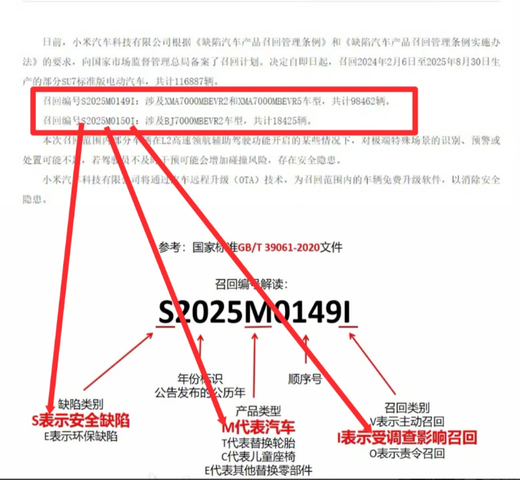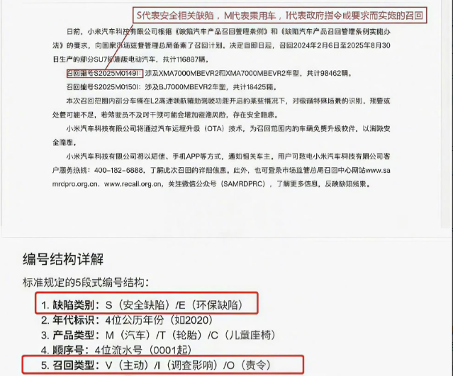 简单地说就是,汽车涉及到了安全缺陷,那么就要被市场监督管理总局调查召回,并非主机厂主动召回!至于小米是哪一种情况,他并没有说。