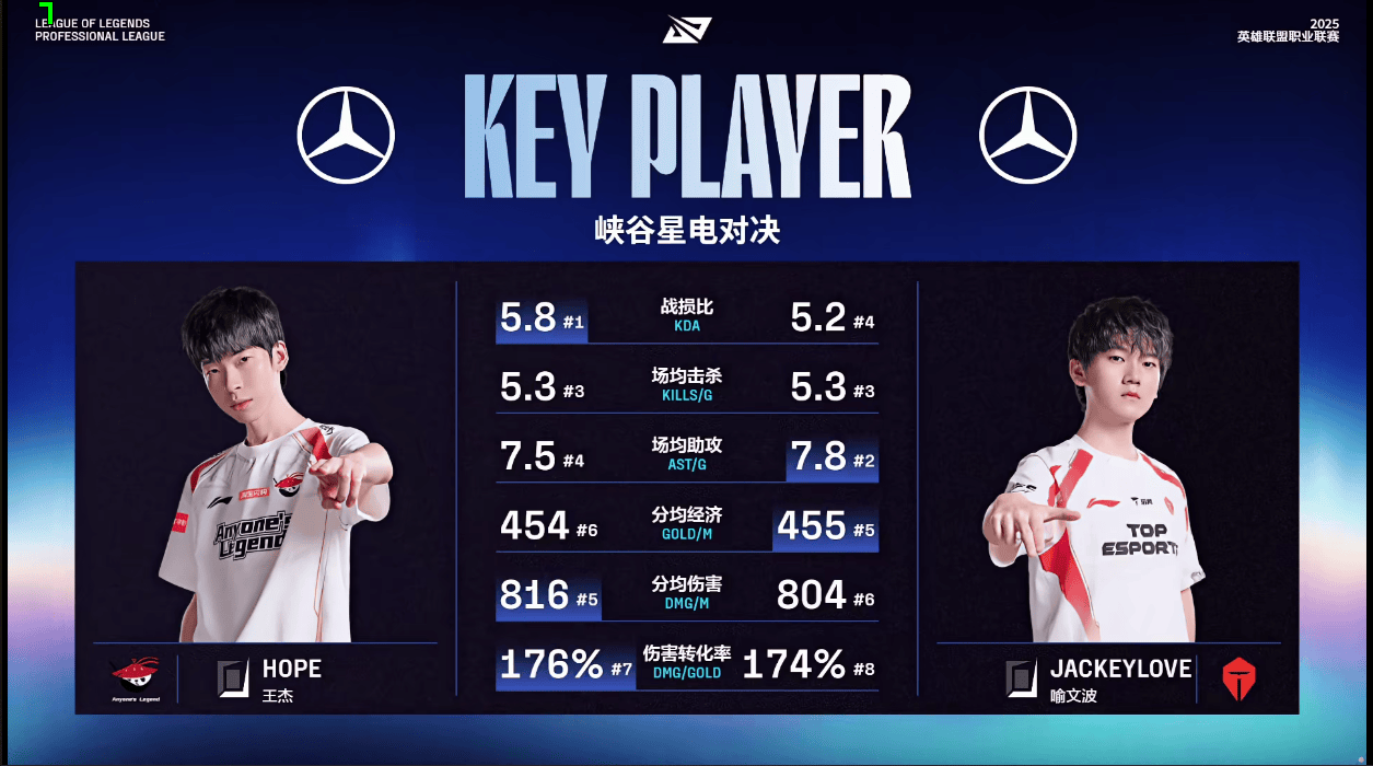 双方射手位选手数据对比:Hope三项数据占优略微领先于杰克