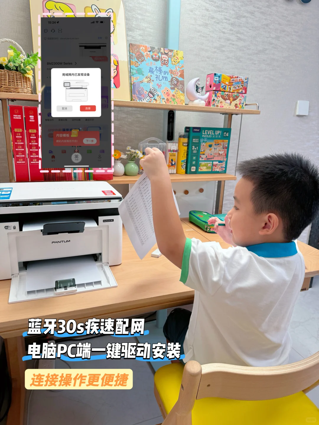 ✅手机连接很快速‼️打开手机蓝牙🛜几十秒就配好网络,简单到老人都能学会。现在老师发资料,就算加班,我直接在奔图小程序一键智能远程打印,家里打印机立刻工作,不会耽误yeye的作业