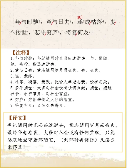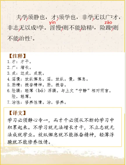 品德高尚的人的行为操守,用屏除杂念干扰、宁静专一来修养身心,用俭朴节约来培养品德。不能内心恬淡就无法明确志向,不能宁静专一就无法达到远大目标。学习必须静心专一,而才干必须从不断的学习中积累起来。不学习就无法增长才干,不立志就无法成就学业。放纵懈怠就不能振奋精神,轻薄浮躁就不能修养性情。年纪随同时光而疾速逝去,意志随同岁月而丧失,最终年老志衰,大多对社会没有任何贡献,只能悲哀地坐守着那陋室,(到那时再悔恨)又怎么来得及!
