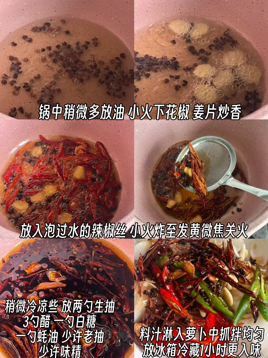 附做法: 1️⃣干辣椒丝提前泡水;白萝卜连皮一起切薄片,放两小勺盐、一小勺糖抓匀腌制半小时 2️⃣腌完用手攥干水分,放大量蒜片,少许小米辣 3️⃣锅中稍微多放点油,放花椒、姜片小火炒香,小火放泡过水的辣椒丝,炸至发黄微焦关火 4️⃣稍微冷凉一些,放两勺生抽、三少醋、一勺蚝油、一勺白糖、少许老抽、少许味精 5️⃣搅拌均匀后淋在萝卜上,抓拌均匀(冰箱冷藏一小时后更好吃) -